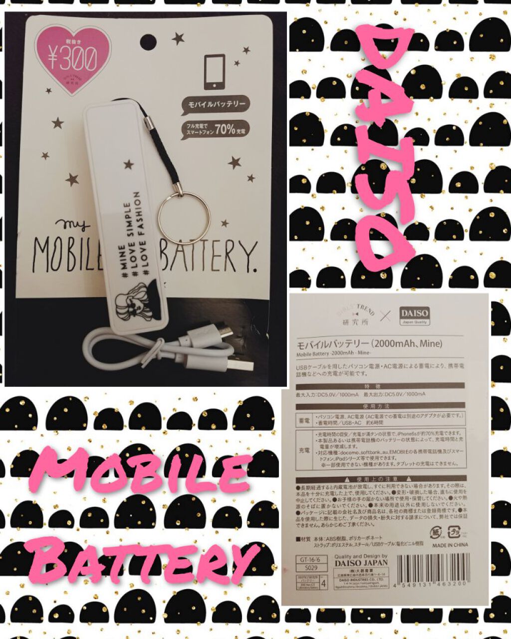 DAISOにもモバイルバッテリー売ってると!(@_@) ネットで評判を見るとなかなかいいので買いに行きました。 5000mAhと10000mAhがあって10000の方は少しサイズが大きかったので5000にしたけど、十分なもちでした。 5000が700円+70円(税)、10000が1000円+100円(税)でした。 残量チェックボタンもついてて優秀です✨