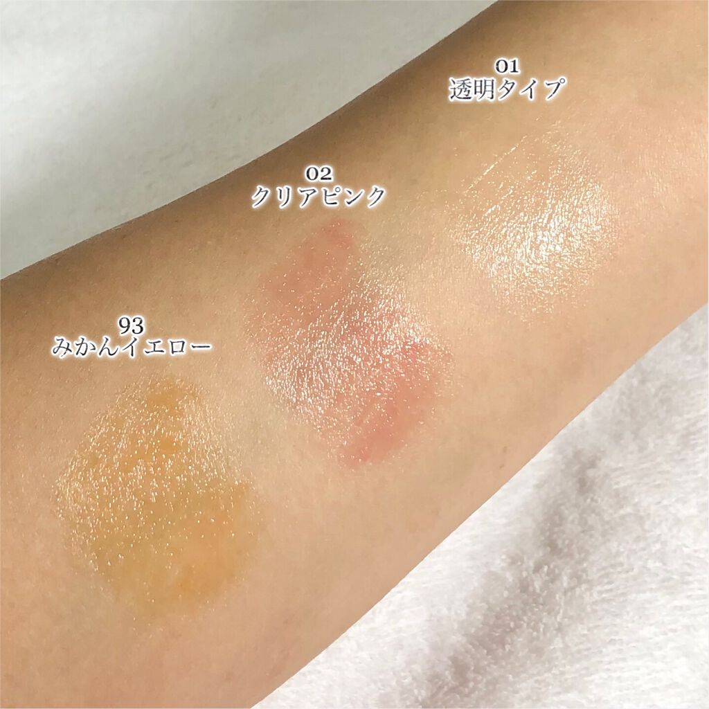 - <01 クリア> 水添ポリイソブテン、ワセリン、オリーブ果実油、ジエチルヘキサン酸ネオペンチルグリコール、スクロース、ポリエチレン、リンゴ酸ジイソステアリル、ジフェニルシロキシフェニルトリメチコン、ジメチルシリル化シリカ、キャンデリラロウ炭化水素、水添ヒマシ油、セスキイソステアリン酸ソルビタン、メントキシプロパンジオール、BG、水、ソメイヨシノ葉エキス、カミツレ花エキス <02 クリアピンク> 水添ポリイソブテン、ワセリン、オリーブ果実油、ジエチルヘキサン酸ネオペンチルグリコール、スクロース、ポリエチレン、リンゴ酸ジイソステアリル、ジフェニルシロキシフェニルトリメチコン、ジメチルシリル化シリカ、キャンデリラロウ炭化水素、水添ヒマシ油、セスキイソステアリン酸ソルビタン、メントキシプロパンジオール、トコフェロール、水酸化Al、BG、水、ソメイヨシノ葉エキス、カミツレ花エキス、酸化チタン、黄4、赤202、酸化鉄 <03 みかんイエロー> 水添ポリイソブテン、ワセリン、オリーブ果実油、ジエチルヘキサン酸ネオペンチルグリコール、スクロース、ポリエチレン、リンゴ酸ジイソステアリル、ジフェニルシロキシフェニルトリメチコン、ジメチルシリル化シリカ、キャンデリラロウ炭化水素、水添ヒマシ油、セスキイソステアリン酸ソルビタン、メントキシプロパンジオール、トコフェロール、BG、水、ソメイヨシノ葉エキス、カミツレ花エキス、黄4、赤202、酸化鉄