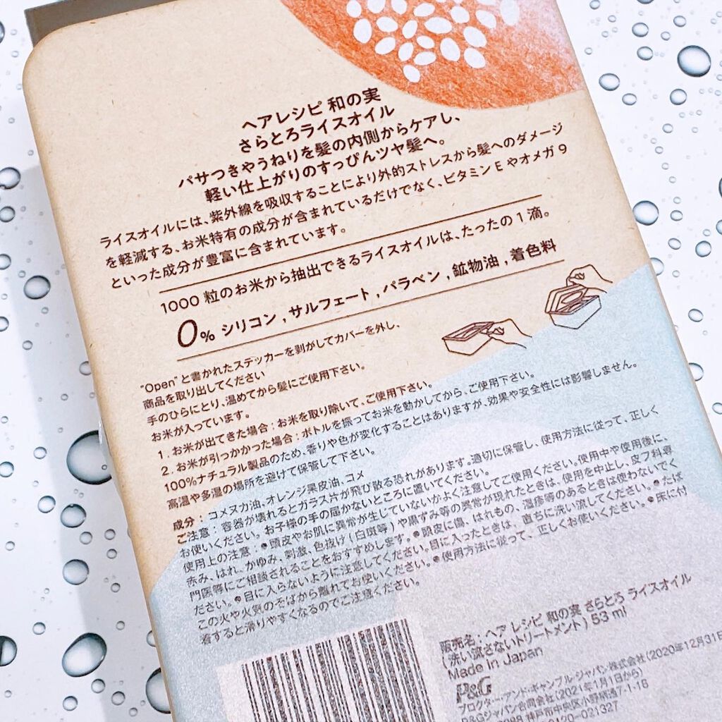- 国産のピュアな米ぬかオイル*1 が、パサつく髪の内側まで浸透、補修するお米のヘアオイル。 芯からしっとり、なのにべたつかない。 ●古来より伝わる米ぬか美容 古来より、お米には優れた美容効果があることが知られており、肌や髪のうるおいを保つために使われてきました。 「和の実 by ヘアレシピ」はそんなお米のちからに着目。お米由来のヘアケアで、うるおいに満ちた、天使の つや髪へ導きます。 ●1000 粒からたった 1 滴しか採れない貴重な米ぬかオイル*1 米ぬかと米胚芽から抽出される米ぬかオイル*1 は、お米 1000 粒からたった 1 滴しか採れない貴重なオイルです。 独自に開発された精製方法により、日本国内で丁寧に抽出された米ぬかオイル*1 には髪に必要な成分が ぎゅっと濃縮されており、その 1 滴 1 滴が、髪本来の美しさを引き出します。 ●高い浸透力で髪の内側と外側からダブルでアプローチ 日本人の髪はキューティクルが厚くて硬いため、有用成分が浸透しにくいと言われています。そんな日本人の 髪にぴったりなのが米ぬかオイル*1 です。浸透力が非常に高い米ぬかオイル*1は、厚くて硬いと言われる日本人 の髪のキューティクルにも、内側までしっかり浸透します。さらに、外的ストレスからも髪を守って、内と外の両方から アプローチすることで、自然に輝くような、美しい髪を叶えます。 *1 コメヌカ油(浸透性ツヤ成分) ※2022年リニューアル発売