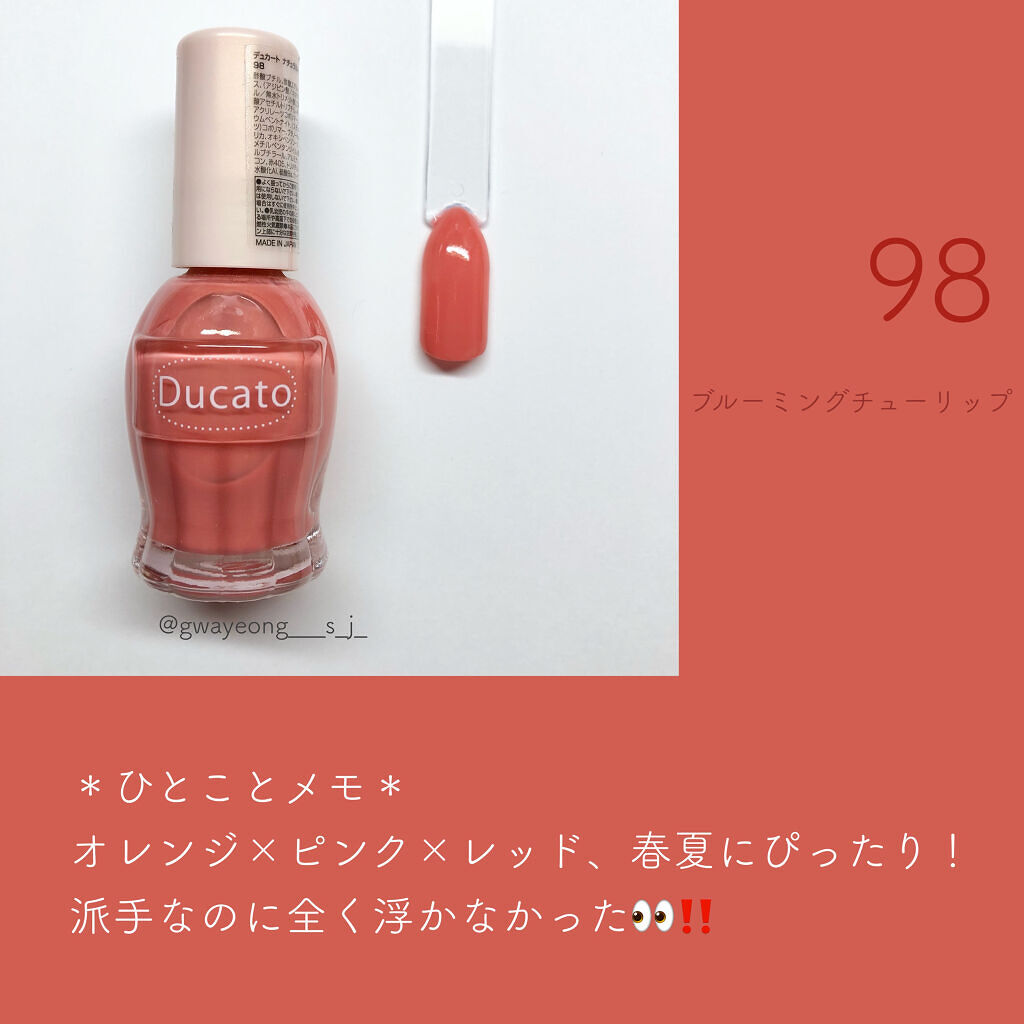 Ducatoは✔︎液サラサラ、塗ムラゼロ✔︎セルフネイル初心者、苦手な方向け(←私もです)✔︎名前がかわいい✔︎ナチュラルカラー、かわいいカラー揃い✔︎服と組み合わせやすい✔︎結構使っても固まらない&糸引かない✔︎コスパよし!✔︎1度塗り、2度塗り、3度塗りどれでもかわいい✔︎派手なカラーも肌馴染みよし✔︎限定色の特別感🙆♀️