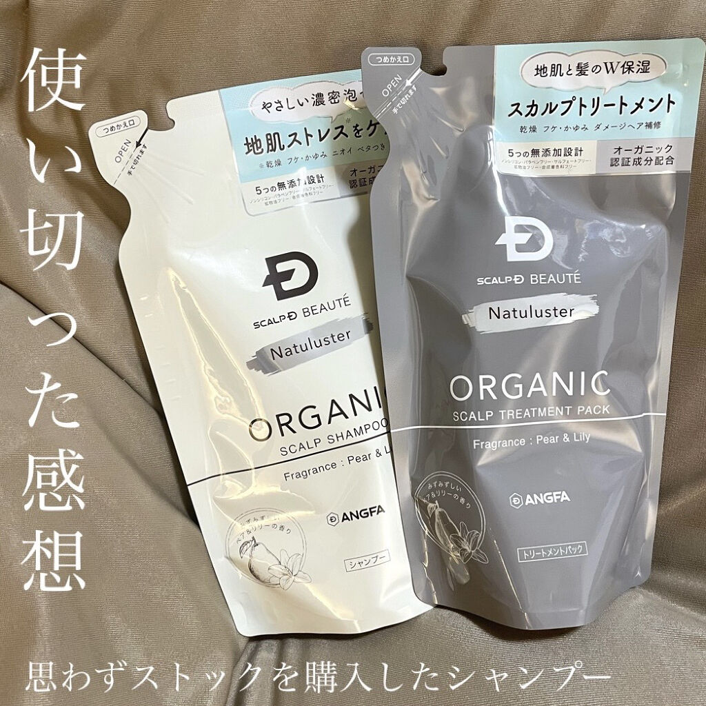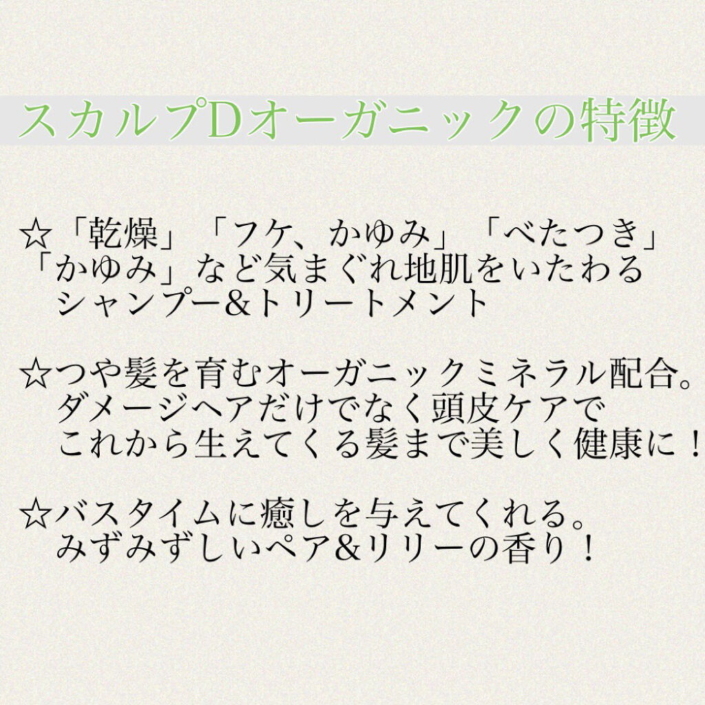- スカルプDのオーガニックシャンプーは、毎日のシャンプー&トリートメントで髪の土台となる頭皮ケアが簡単に出来、さらツヤ髪へと導きます。 乾燥・かゆみ・ベタつき・ニオイを感じる気まぐれな頭皮に、10種類のオーガニック認証成分でアプローチするアミノ酸系の洗浄成分を使用したシャンプー。 敏感な頭皮を優しく包み込む濃厚もっちり泡で、毛穴に詰まった皮脂や汚れを優しく洗い流します。 70種類以上の豊富なミネラルが髪をコートすると同時に、シャンプーの泡がキューティクルの間に挟まる有害物質(金属、イオン等)を取り除きツヤ髪へ導きます。 トリートメントは髪だけでなく頭皮まで保湿でき、乾燥とかゆみを防ぎます。さらに、優しさだけでなくツヤにもこだわり、健康食品にも使用されるハイグレードのオーガニックミネラルを配合。 トリートメントでひらいたキューティクルを整えることで、ツヤ髪へ導きます。 バスタイムに癒しを与える上品なペア&リリーの香り