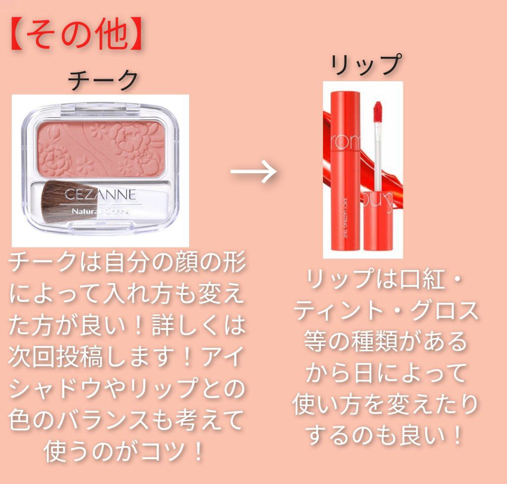他と比べて1番薄づき! イエベにもブルベにもOK! 1番使いやすい色!ピンク系の色 名前の通りの色でベージュ・ブラウン系の色が好きな人にはおすすめ! オレンジ🧡Theイエベっていう感じの色! 青みピンクTheブルベっていう感じの色!