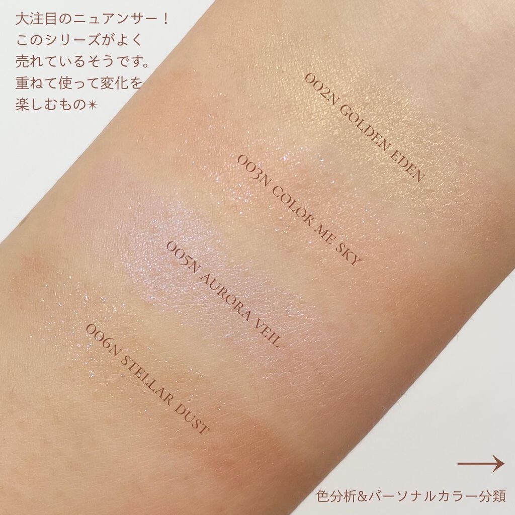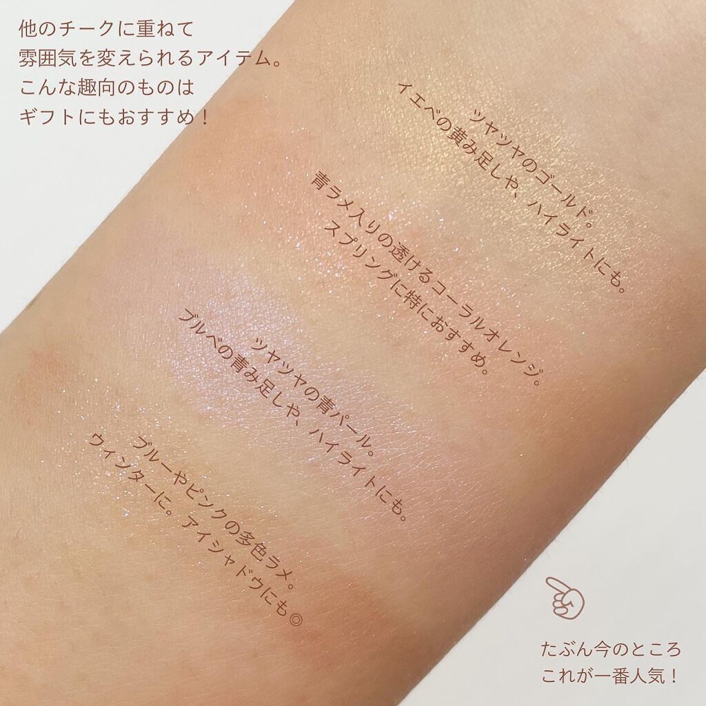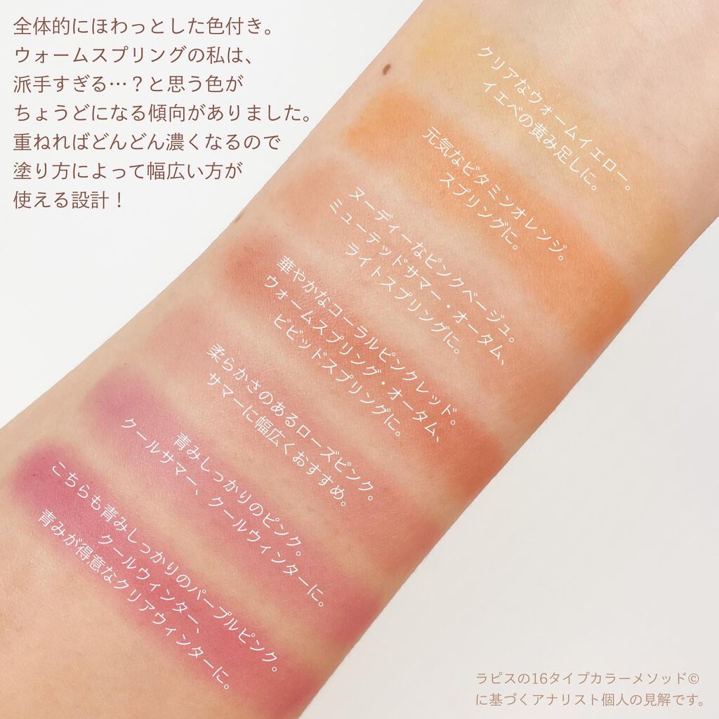 全28色という選びきれない色展開… 絶妙なおしゃれカラーがたくさんあるので、 困り果てて15色も購入してしまいました😮💨✨ マット・パール・ニュアンサーの3つの質感に 分けられていますが、中でも特にニュアンサーが人気! 重ねて使って印象チェンジができるものです。 でもマットもパールもかわいすぎて…🤦🏻♀️ どれも頬にふわっと溶け込むような発色なので、 慣れていなくても付けすぎることなく安心♡ ムラにもなりにくいですよ〜! 私のいちおしは002pのhazy sunset! みなさんもぜひお気に入りを見つけてくださいね🥰