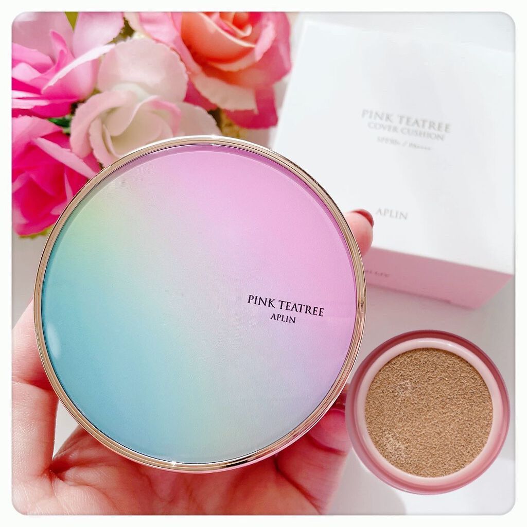 APLIN ピンクティーツリーカバークッション 21号ライトベージュ 2,490円(税込) 少量でよく伸びてハイカバー! 赤みやくすみをしっかりカバ一できるのに、厚塗り感のないなめらかな仕上がり♡ ハイカバーなのにナチュラルなツヤ感とサラッとしつつ、乾燥崩れしにくい仕上がりに感動します!!