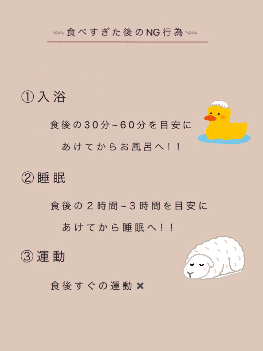 1 日 で 激 太 り す る こ と は 、誰 で も 絶 対 にあ り ま せ ん ✖️ 太 る 原 因 は 、積 み 重 ね で す❕❕ 食 べ た ら 体 重 は 増 え ま す 🙀 モ デ ル さ ん で も ア イ ド ル さ ん で も 、誰 で も 食 べ た 後 は 体 重 は 重 く な り ま す 。。 食 後 3 0 分 ~ 6 0 分 を 目 安 に あ け て か ら 入 浴 し て 下 さ い ✔️ 食 後 2 時 間 ~ 3時 間 た っ て か ら 寝 る よ う に し て 下 さ い ✔️ 2 時 間 ~ 3 時 間 た っ て か ら 運 動 を す る よ う に し て 下 さ い ✔️ 常 温 の 水 or 白 湯 を 2 L 飲 む . 朝 食 は 食 べ 過 ぎ な い 程 度 に と る . 昼 食 は 野 菜 サ ラ ダ を 必 ず と る . 1 5 分 以 上 ウ ォ ー キ ン グ を す る . 間 食 に 気 を つ け る .