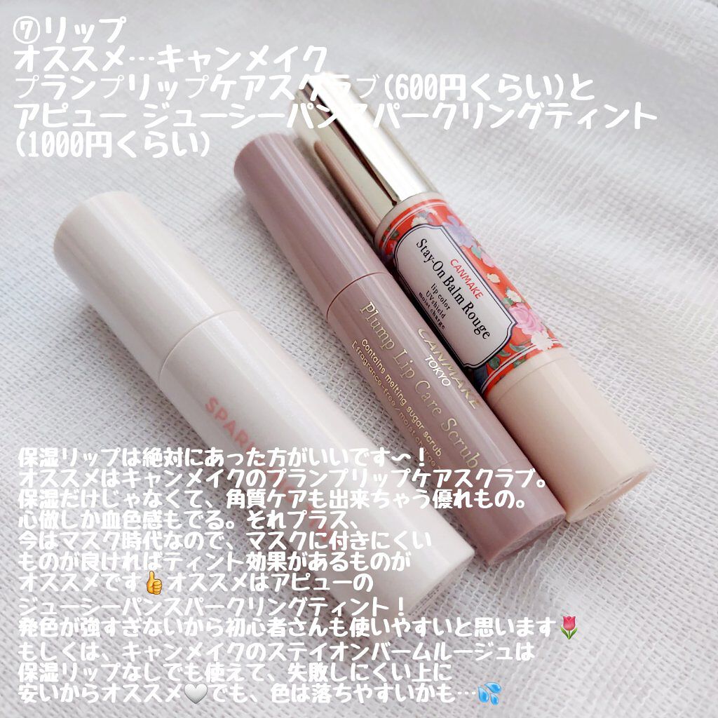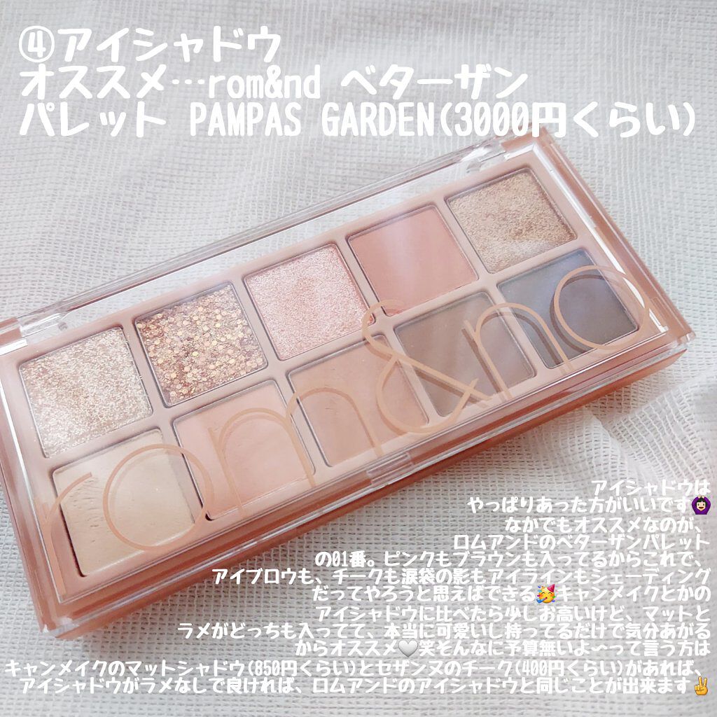 オススメ…スキンアクア トーンアップUVエッセンス(800円くらい) オススメ…the SAEM カバーパーフェクト チップ コンシーラー(800円くらい) オススメ…イニスフリー ノーセバムミネラルパウダー(パクト)(800円くらい) オススメ…rom&nd ベターザンパレット PAMPAS GARDEN(3000円くらい) オススメ…SHISEIDOのビューラー (800円くらい) オススメ…キャンメイクのマスカラ (700円くらい) オススメ…キャンメイク プランプリップケアスクラブ(600円くらい)とアピュー ジューシーパンスパークリングティント(1000円くらい)