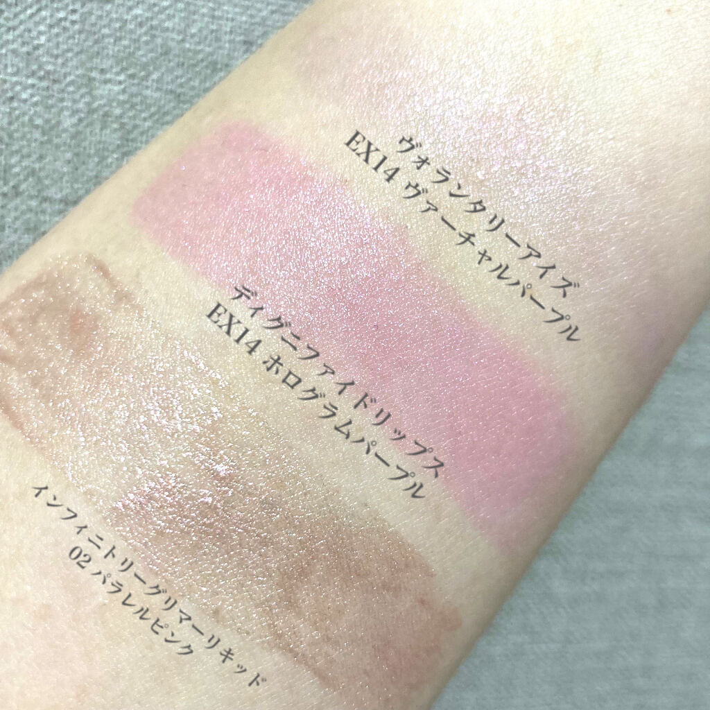 淡いピンクのカラーもさることながら 多色ラメ(ピンクラメが多めかな🤔?)の 煌めきが綺麗〜✨ 02 Innocent Auraのアクアジェムは 淡いピンクカラーなので、 うすーく伸ばしてハイライトっぽくも使えるかなと目論見中です🤣笑 アイシャドウとしての使用は抜群に可愛いです🥰