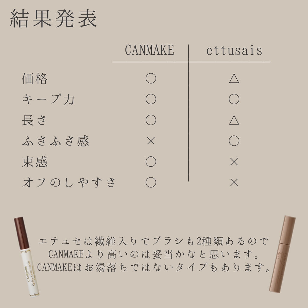 私はキャンメイクのクイックラッシュカーラーとエテュセのマスカラベースでつくるのが最近のハマりメイクです。 クイックラッシュカーラーはもちが良いのですが、まつ毛とまつ毛をくっつける能力が高すぎて、束間には良いのですがナチュラルさは少し減る特徴があります。 これで整えると、ノーメイクでこれです♪みたいな自然な仕上がりになります♡
