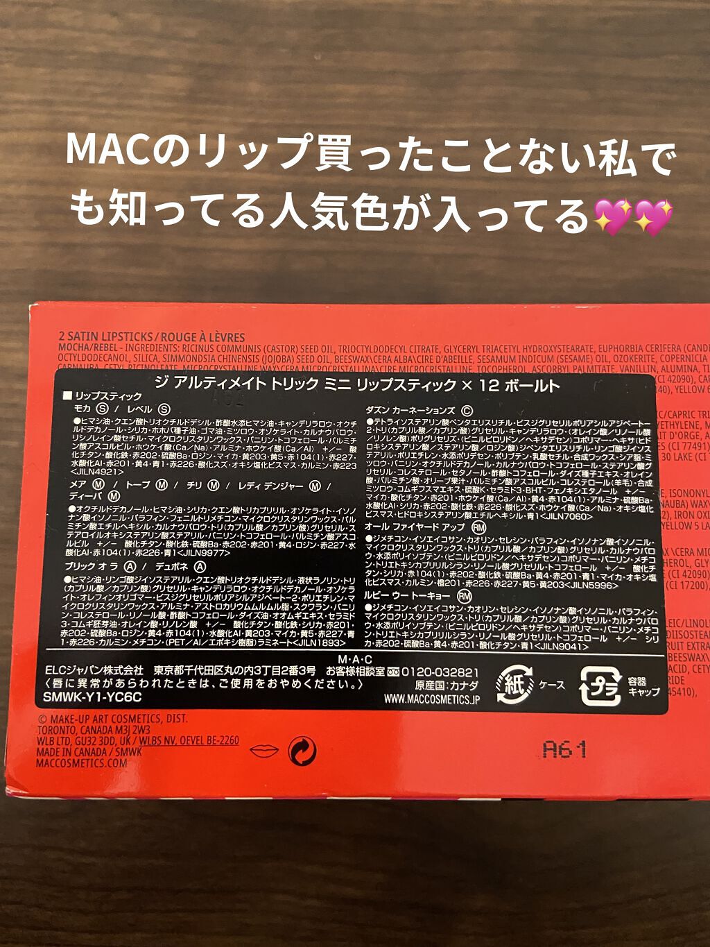 M·A·Cのホリデー、ジアルティメイトトリックミニリップスティック×12ボールトちょうど新しい口紅欲しいな~と思ってたら見つけてしまったので衝動買い。左からS①モカ:ピーチがかったイエローブラウンM②メア:ミッドトーンモーヴピンクA③ブリック...
