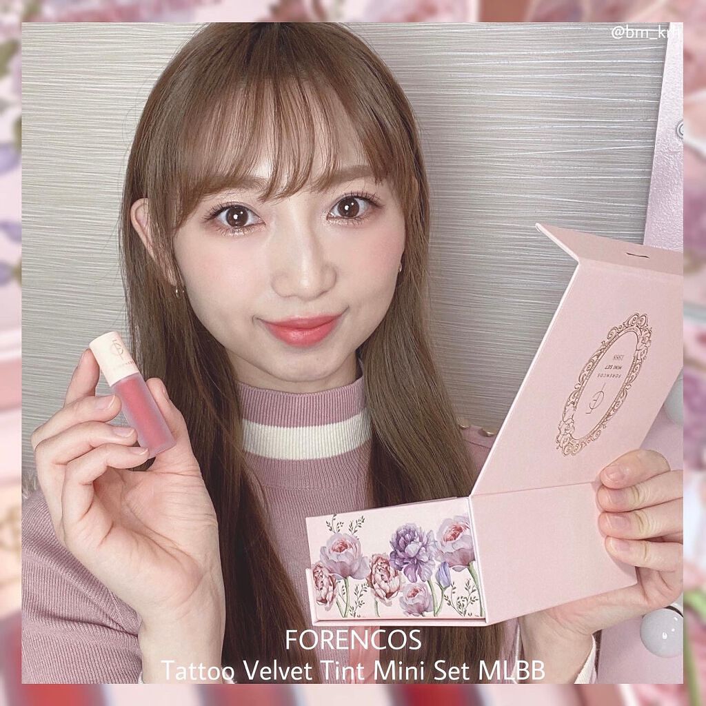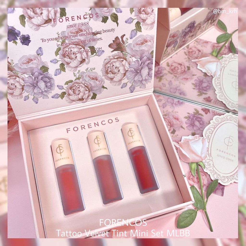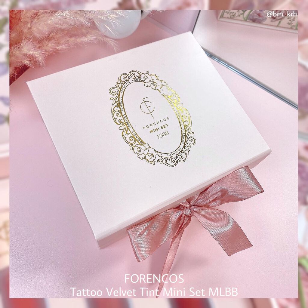 フォレンコスベルベットティント30パケも可愛く高級感あり持ってるだけでも可愛い!!1度塗ったらなかなか落ちないのでオススメマットティントです!乾燥もあまり感じられなくポロポロ感はないです!クレンジングでも1度では落ちないのでちょっと大変💦#韓...