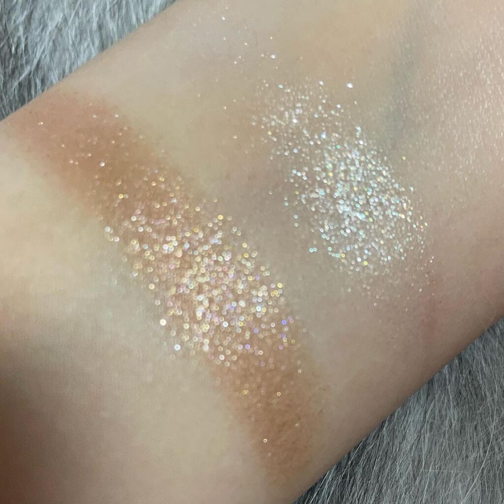 mude.の方がよりあたたかみのある印象で全体的に使いやすい色味が入っている感じ◎ ラメ感もギラギラするよりかは上品なキラキラ感✨ rom&ndはmude.に比べるとフレッシュな印象!春や夏に使うと映えそう❣️ ラメ感も強く、目立つかな。 似てるかもしれないからと買うのを長い間悩んでいましたが、仕上がりが全然変わってくるので、買って良かった😂❤️ 粉質はブランドも違うので違ったよ✨ rom&ndの方がしっとり感があって強く発色する感じ。 mude.は淡い発色で、初心者さんも使いやすいと思った🫶🏻