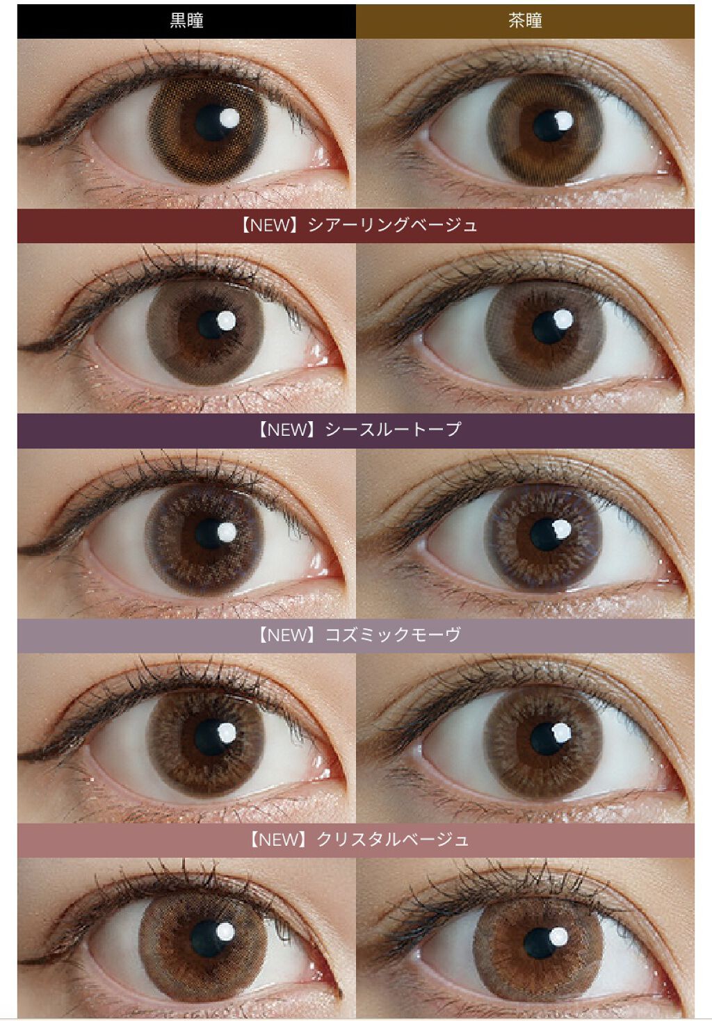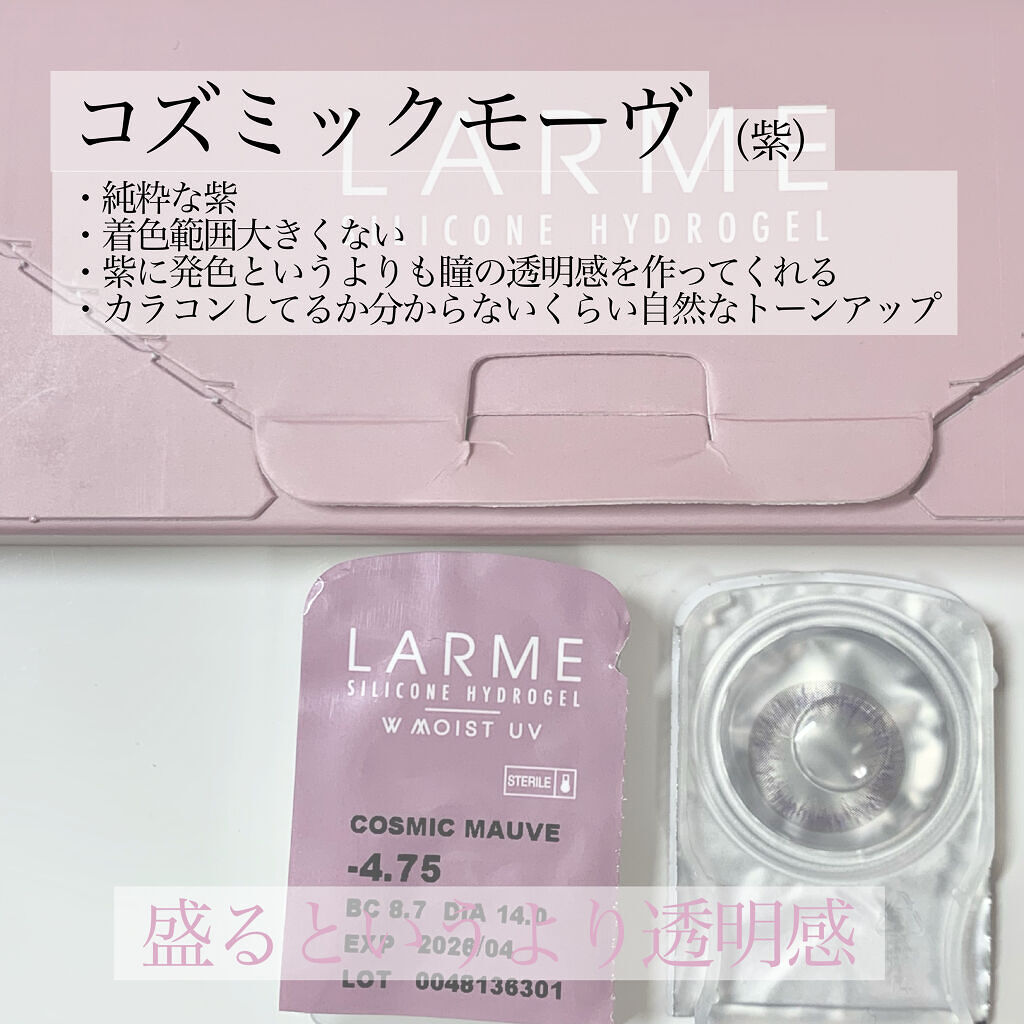 LARMESILICONHYDROGElWMOISTワンデーBC:8.7DIA:14.0目が小さい私にとってはこのサイズは嬉しすぎる!いいところ・自然なサイズ(着色範囲)・装着感の良さがほかのカラコンよりレベチ・4色それぞれ特長が違うから選び...