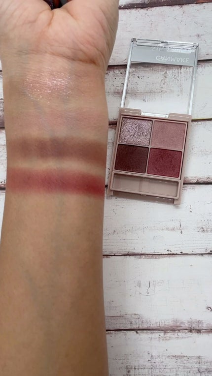 青みがかっているし、赤が若干澄んだような明るさな気がしたので、ブルベさん向きのカラーだとは思うけど、色味がとても好きなのでついつい買ってちゃいました🤣笑 使ってみた感想は、ポイントになる赤や、締めの紫がかったブラウンを範囲狭めに塗ればかなり使いやすかったです😍👌❤️ そしてラメもうる艶っとしていて可愛い❤️❤️❤️✨ キャンメイクさんは発色が割と優しめなので、あまりパーソナルカラー気にせず使えるのがやっぱり良い所だな〜って気がします👏😭✨