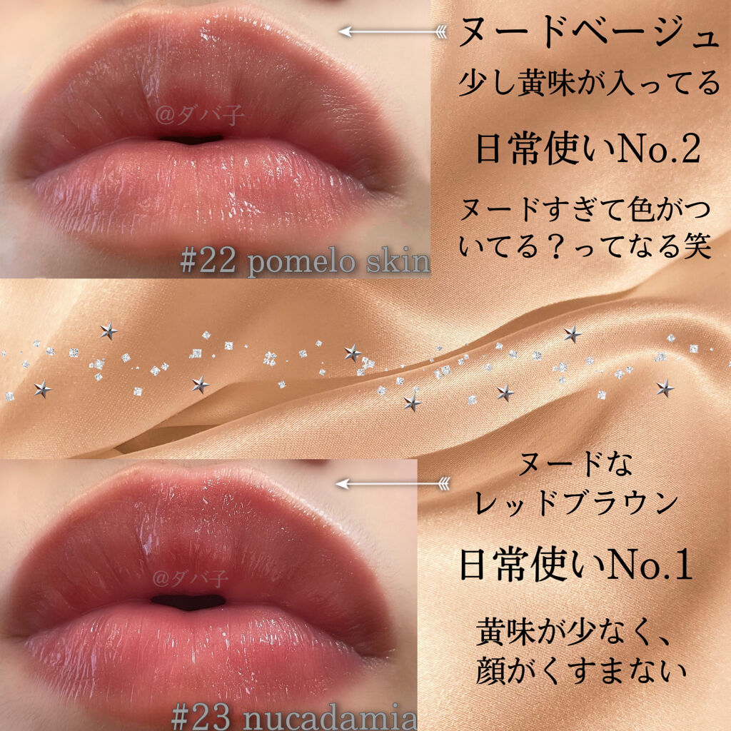 今回のrom&ndが全色ヌード系で 色が濃くて使うのが少し難しいなぁ〜 ナチュラルな色味のティントが欲しいな〜 日常使いにも抜群ですので、ぜひぜひ〜 色持ちが良い ベタつかない うるおいも長時間持つ ティント力がすごい 22番 POMELO SKIN 少し黄味の入ったヌードベージュ 発色が強すぎないのでデイリー使い 23番 NUCADAMIA ヌードなレッドブラウン 色気があるけどヘルシーなおしゃれな色味 24番 PEELING ANGDOO 青み寄りのヌードピンクレッド 25番 BARE GRAPE くすみローズなヌードピンク 品のある大人カラー 黄味ピンクでどんなメイクにも馴染んでしまう パッケージも既存の物よりどれがどの色かより把握しやすく パッケージもすごく可愛いのでおすすめです