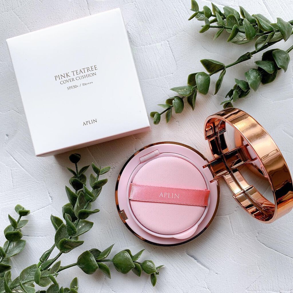 APLIN ピンクティーツリーカバークッション 21号ライトベージュ 2,490円(税込) 少量でよく伸びてハイカバー! 赤みやくすみをしっかりカバ一できるのに、厚塗り感のないなめらかな仕上がり♡ ハイカバーなのにナチュラルなツヤ感とサラッとしつつ、乾燥崩れしにくい仕上がりに感動します!!