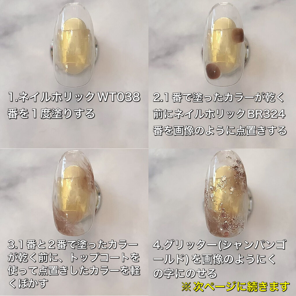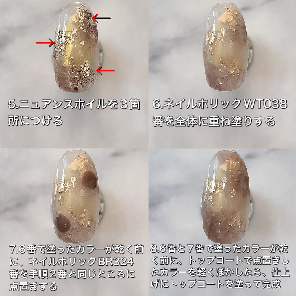 ワンカラーでも指ごとに色を変えるだけでオシャレに見えます💕 画像のようにゴールドラインとストーンを少し足すだけで華やかさがアップ🥰 何度かご紹介したことのあるスポンジで作るグラデーションです✨ スポンジを使うことで境目が綺麗に馴染んでくれます💕 アルミホイルの上でブラウンとトップコートを1:1くらいで混ぜたものを、トップコートのハケに取って3箇所に塗るだけ👌 事前に混ぜたものを塗ることで、爪の上でぼかすより簡単に出来ます💕 ベースカラーが乾く前に点置きしてぼかすことで綺麗にぼかせます✨ スピードが大事なので、使うポリッシュのキャップは全て開けておきましょう😊 天然石のラインはガタガタの方がより天然石っぽく見えるので、ラインを描くのが苦手な方でも大丈夫🙆♀️ 難しそうに見えて、やってみると意外と簡単に出来ます♡