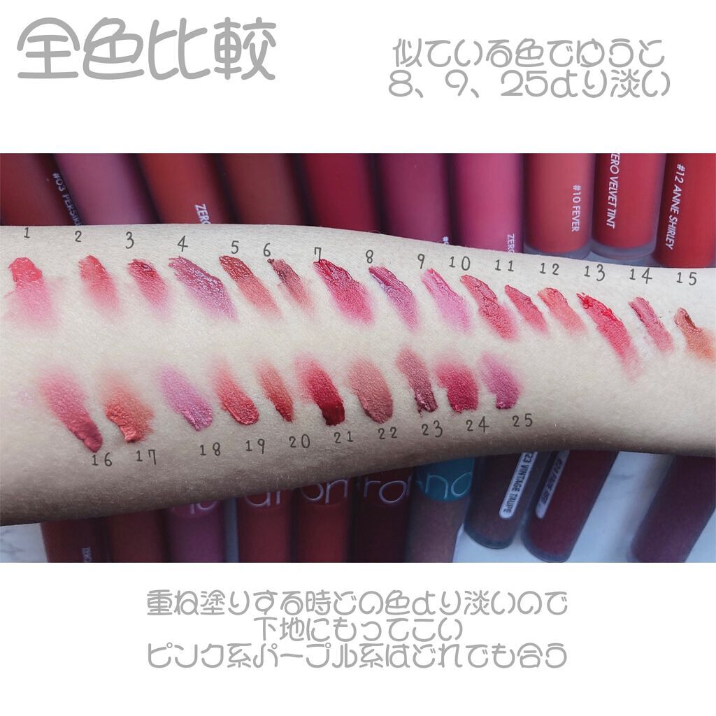 ジューシーラスティングティントで有名なrom&ndですが私は断然こっち派です。 ゼロベルベットティントはもったりふわっとした質感で一番好きな点はほんっとに落ちない! 一概にゼロベルベットティントと言っても種類が色々ありまして... 18から21は秋冬に使いたい深い色や落ち葉に合うカラーシリーズ 他にもミルクティーベルベットやシースルーマットティントなどマット系カラーは他にもある模様で気になっているところです!!