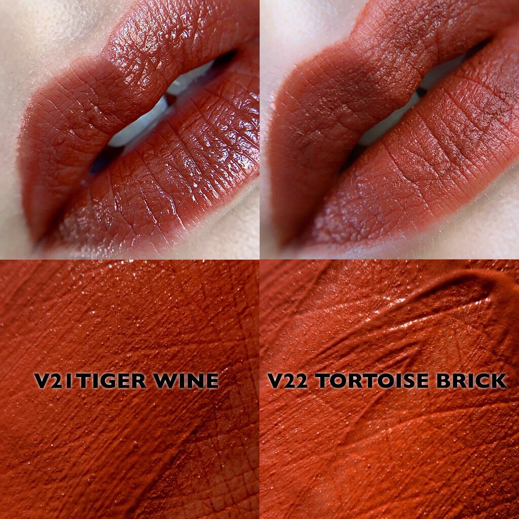 ふんわりとしたテクスチャーで綺麗に発色します🌟 重ね付けしてもあまり色が変わらないのでティントを使い慣れていない方も塗りやすいと思います👌ムラになりにくい‼︎ タイガーワインとタートイズブリックは今まで使ったことがないカラーだったので最初、腕で試したとき戸惑いましたが唇に乗せてみると意外と自然‼︎ どのカラーも、モード系のファッションに合うと思うのでかっこよく魅せたい時にいいと思います🌟