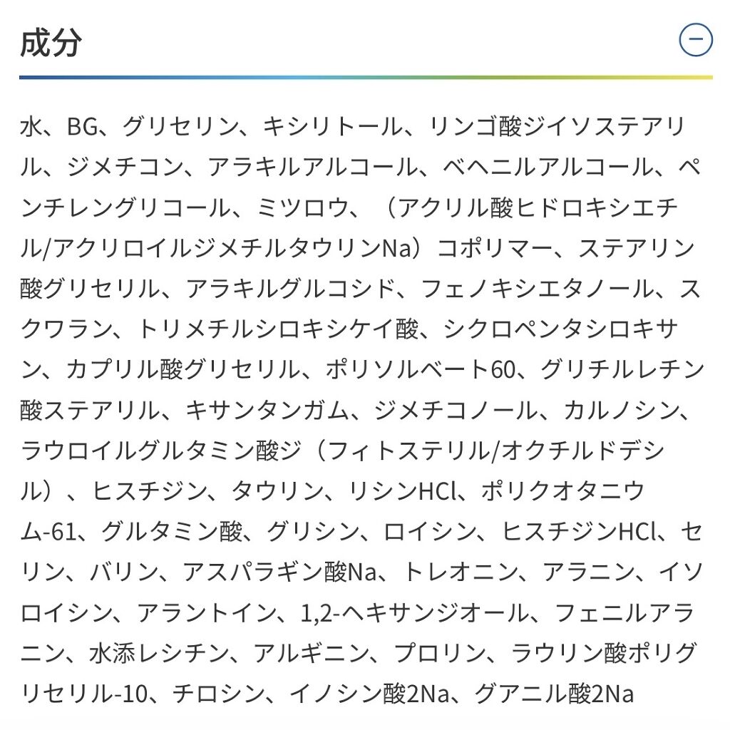 - <100g> 水、BG、グリセリン、キシリトール、リンゴ酸ジイソステアリル、ジメチコン、アラキルアルコール、ベヘニルアルコール、ペンチレングリコール、ミツロウ、(アクリル酸ヒドロキシエチル/アクリロイルジメチルタウリンNa)コポリマー、ステアリン酸グリセリル、アラキルグルコシド、フェノキシエタノール、スクワラン、トリメチルシロキシケイ酸、シクロペンタシロキサン、カプリル酸グリセリル、ポリソルベート60、グリチルレチン酸ステアリル、キサンタンガム、ジメチコノール、カルノシン、ラウロイルグルタミン酸ジ(フィトステリル/オクチルドデシル)、ヒスチジン、タウリン、リシンHCl、ポリクオタニウム-61、グルタミン酸、グリシン、ロイシン、ヒスチジンHCl、セリン、バリン、アスパラギン酸Na、トレオニン、アラニン、イソロイシン、アラントイン、1,2-ヘキサンジオール、フェニルアラニン、水添レシチン、アルギニン、プロリン、ラウリン酸ポリグリセリル-10、チロシン、イノシン酸2Na、グアニル酸2Na