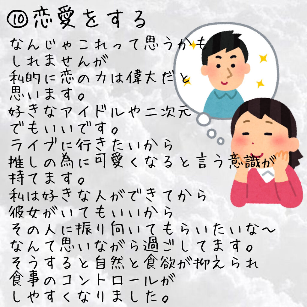 初めまして。『好きな人の為に頑張る専門学生(女)』です。私は子供の頃から肥満体型で、中学の頃はMAX103kgあった体重を何とか85kgまで落とし、そしてまたリバウンドをして95kgに…そして3ヶ月で無理なく6kg落とすことが出来た私のダイエ...