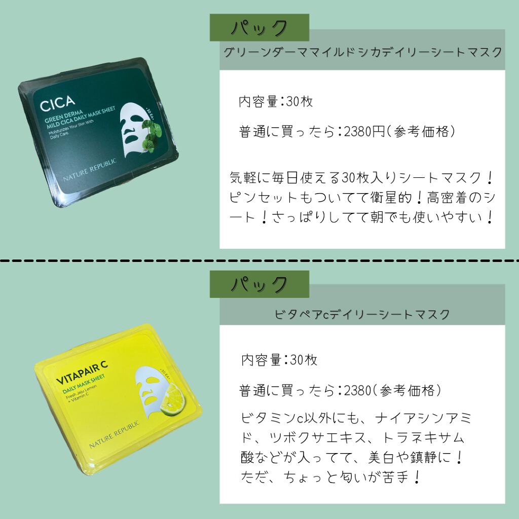 ネイチャーリパブリック グリーンダーマCICA デイリーシートマスク | 2,380円 |