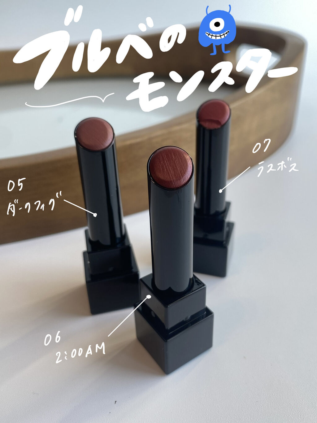\パーソナルカラー別/ ブルベ〜ニュートラルカラーの リップモンスター13種比較です🙌🏻 01欲望の塊 ブルベ夏 02Pinkbanana 1stイエベ春2ndブルベ夏 黄み肌ブルベでもやや黄み強めに感じました! 05ダークフィグ ブルベ夏...