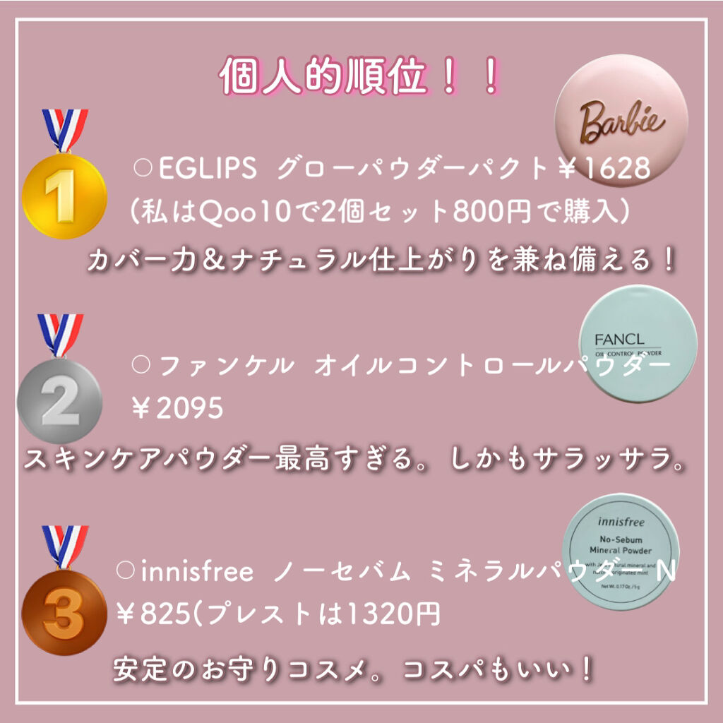 今回はそれぞれをカテゴリー別に分けてレビュー&比較し、最後にトップ3まで順位をつけたので、ぜひ最後まで見て頂けたら嬉しいです😉 キャンメイク マシュマロフィニッシュパウダーML ¥1034 タイムシークレット ミネラルプレストパウダー ¥1980 毛穴パテ職人 エッセンスBBパウダー ML モイストラスティング ¥1540 EGLIPS グローパウダーパクト ¥1628(ちなみに私はQoo10EGLIPS公式サイトで2個セット800円で購入しました。私のものはバービーとのコラボパケです!) d プログラム 薬用 エアリースキンケアヴェール ¥3520 マキアージュ ドラマティックルースパウダー ¥3850 innisfree ノーセバム ミネラルパウダー N ¥825(プレストは1320円) 資生堂 ベビーパウダープレスド ¥350 アクネオ 薬用 スキンケア パウダー ¥3080 ファンケル オイルコントロールパウダー ¥2095