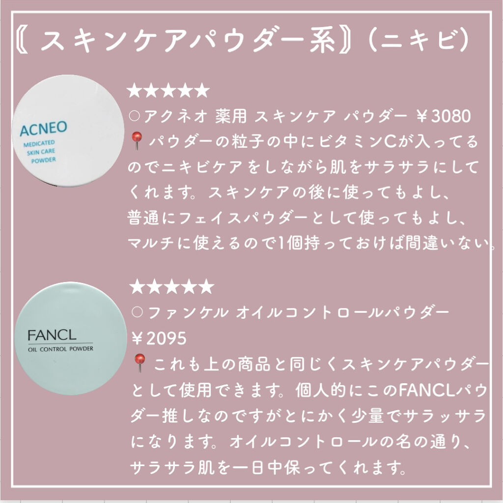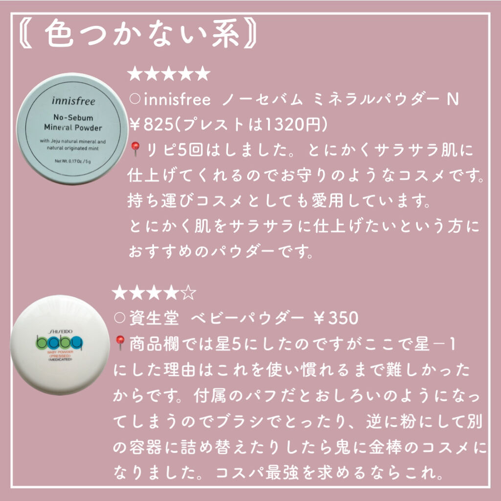 特に夏は化粧が崩れやすいから塗り直しも必要! コスパが良くて、ちゃんと化粧崩れもしにくい6つを紹介するよ🫶 ①CHIFURE ルースパウダー ②CANMAKE マシュマロフィニッシュパウダー ③innisfree ノーセバムミネラルパウダーN ④KATE フェイスパウダーZ ⑤SHISEDO ベビーパウダー ⑥クリアラストフェイスパウダーN 薬用オークル