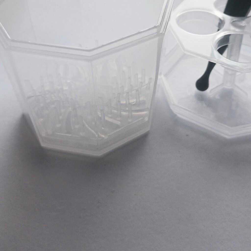 - メイクブラシの皮脂や汚れをきれいに落とします。 くるくる回すだけです。 ブラシの汚れがみるみる落ちます。 洗浄板の中央付近の小さな突起はアイブロウブラシなど毛先の短いブラシも洗えます。