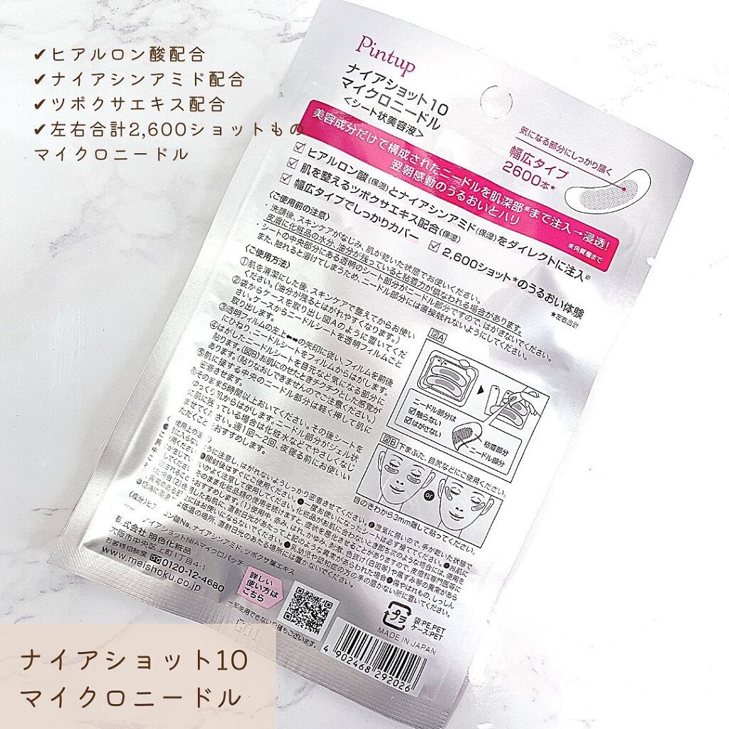 - エイジングケア成分として今話題のナイアシンアミドをはじめ、ヒアルロン酸(保湿)、さらにCICA成分ツボクサエキス(整肌)だけで処方した100%美容成分マイクロニードルシートです。 これまで、気になる部分に上手く貼れず失敗してしまうという声も多かったマイクロニードル。 ナイアショット10の幅広タイプなら貼りやすく、しかも、オイルゲルシートがお肌にぴたっと密着。気になる部分をしっかりカバーしてくれます。 1回につき左右合計2,600本のニードル(1枚1,300本)が肌深部※に直接美容成分を届けます。 また、台形の形状のものとは違い、しっかりと肌に針が刺さります。 ※角質層まで