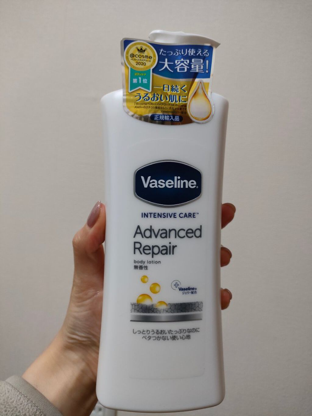 ヴァセリンアドバンスドリペアボディローション400mlアットコスメショッピングで購入しました。(1,078円)肌が弱めの5歳娘と一緒に使用していますが、伸びがよく、翌朝までしっとりします。"セラミド以上の浸透成分配合"というワードの通り、ボデ...