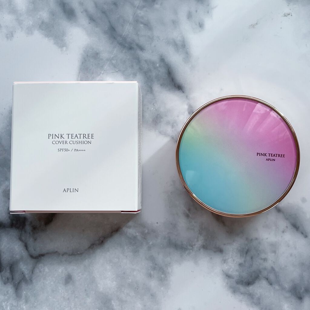 APLIN ピンクティーツリーカバークッション 21号ライトベージュ 2,490円(税込) 少量でよく伸びてハイカバー! 赤みやくすみをしっかりカバ一できるのに、厚塗り感のないなめらかな仕上がり♡ ハイカバーなのにナチュラルなツヤ感とサラッとしつつ、乾燥崩れしにくい仕上がりに感動します!!