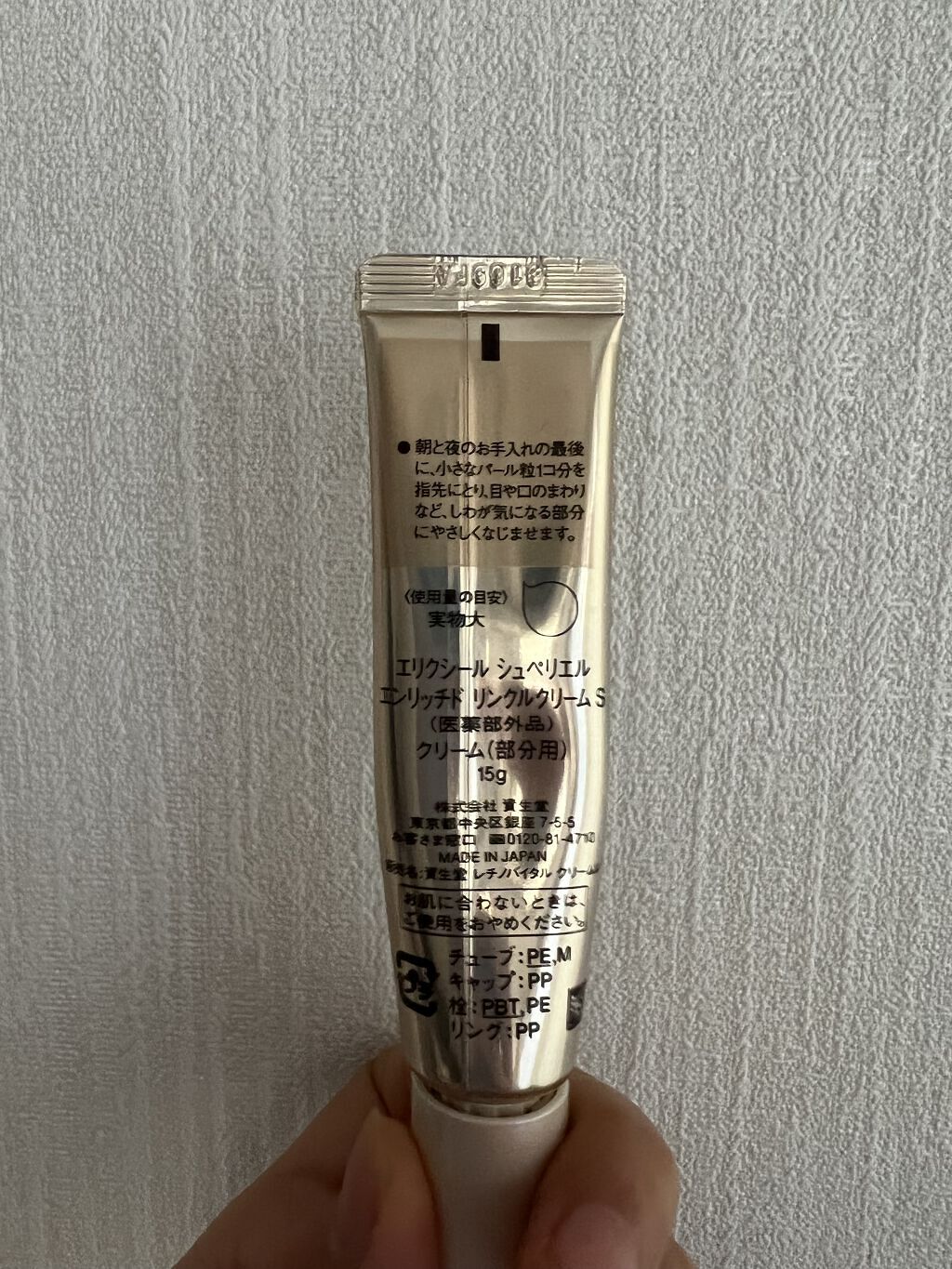 - <S> 有効成分 レチノール、酢酸DL-α-トコフェロール その他の成分 水溶性コラーゲン(F)、濃グリセリン、精製水、テトラ2-エチルヘキサン酸ペンタエリトリット、1,3-ブチレングリコール、ジプロピレングリコール、エタノール、メドウフォーム油、ポリエチレングリコール1000、メチルポリシロキサン、アクリル酸ナトリウム・アクリロイルジメチルタウリン酸ナトリウム共重合体/イソヘキサデカン/ポリソルベート80、ポリプロピレングリコール、ポリオキシエチレン硬化ヒマシ油、トリイソステアリン酸グリセリル、ベヘニルアルコール、ヒドロキシエチルセルロース、ポリビニルアルコール、ステアリルアルコール、モノラウリン酸ポリオキシエチレンソルビタン(20E.O.)、ジブチルヒドロキシトルエン、エデト酸三ナトリウム、ピロ亜硫酸ナトリウム、アセチル化ヒアルロン酸ナトリウム、酵母エキス(3)、マリンエラスチン、クララエキス(1)、フェノキシエタノール、香料、β-カロチン <L> 有効成分 レチノール、酢酸DL-α-トコフェロール その他の成分 水溶性コラーゲン(F)、濃グリセリン、精製水、テトラ2-エチルヘキサン酸ペンタエリトリット、1,3-ブチレングリコール、ジプロピレングリコール、エタノール、メドウフォーム油、ポリエチレングリコール1000、メチルポリシロキサン、アクリル酸ナトリウム・アクリロイルジメチルタウリン酸ナトリウム共重合体/イソヘキサデカン/ポリソルベート80、ポリプロピレングリコール、ポリオキシエチレン硬化ヒマシ油、トリイソステアリン酸グリセリル、ベヘニルアルコール、ヒドロキシエチルセルロース、ポリビニルアルコール、ステアリルアルコール、モノラウリン酸ポリオキシエチレンソルビタン(20E.O.)、ジブチルヒドロキシトルエン、エデト酸三ナトリウム、ピロ亜硫酸ナトリウム、アセチル化ヒアルロン酸ナトリウム、酵母エキス(3)、マリンエラスチン、クララエキス(1)、フェノキシエタノール、香料、β-カロチン