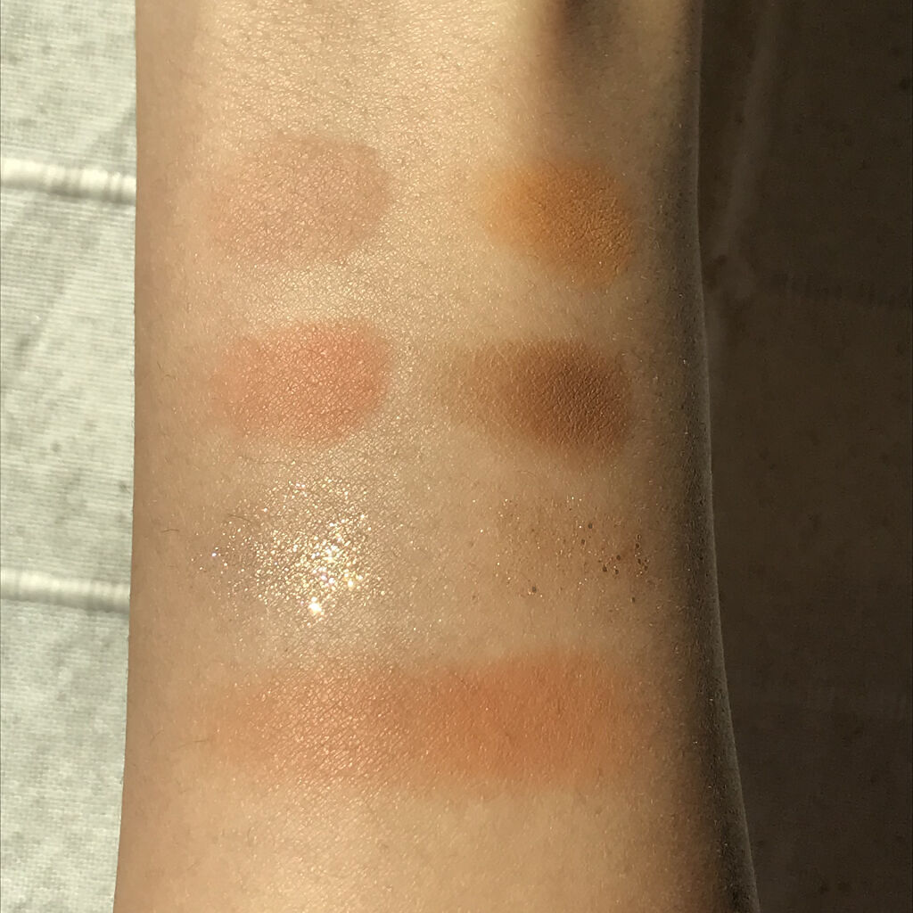 私はスクールメイクにも普段左上をベース、マギ上で涙袋の影と目尻に少し、左下を三角ゾーンにうっすーく入れています^ ^ 黄味のないブラウンでとてもつかいやすいです! 粉質もしっとりしていてマットなカラーですが日光に当たると自然にツヤっとしています、!
