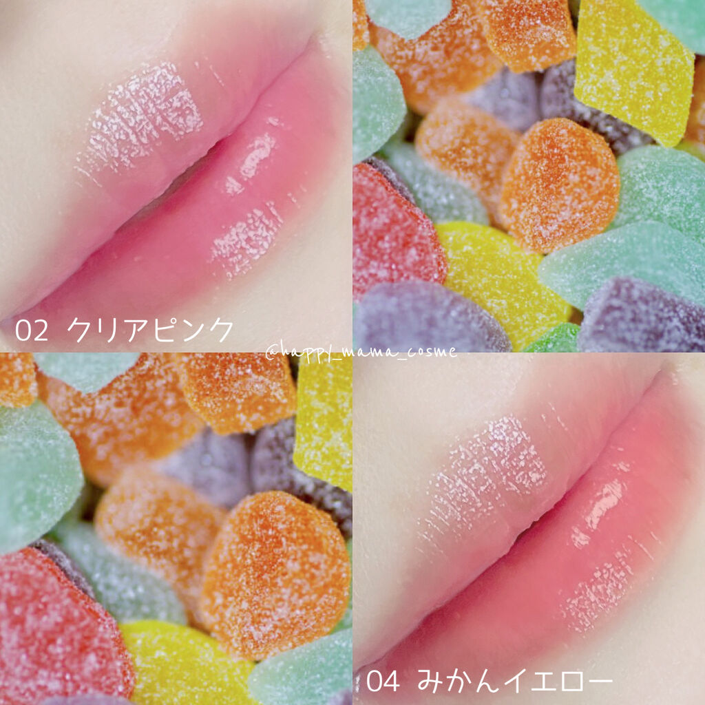 - <01 クリア> 水添ポリイソブテン、ワセリン、オリーブ果実油、ジエチルヘキサン酸ネオペンチルグリコール、スクロース、ポリエチレン、リンゴ酸ジイソステアリル、ジフェニルシロキシフェニルトリメチコン、ジメチルシリル化シリカ、キャンデリラロウ炭化水素、水添ヒマシ油、セスキイソステアリン酸ソルビタン、メントキシプロパンジオール、BG、水、ソメイヨシノ葉エキス、カミツレ花エキス <02 クリアピンク> 水添ポリイソブテン、ワセリン、オリーブ果実油、ジエチルヘキサン酸ネオペンチルグリコール、スクロース、ポリエチレン、リンゴ酸ジイソステアリル、ジフェニルシロキシフェニルトリメチコン、ジメチルシリル化シリカ、キャンデリラロウ炭化水素、水添ヒマシ油、セスキイソステアリン酸ソルビタン、メントキシプロパンジオール、トコフェロール、水酸化Al、BG、水、ソメイヨシノ葉エキス、カミツレ花エキス、酸化チタン、黄4、赤202、酸化鉄 <03 みかんイエロー> 水添ポリイソブテン、ワセリン、オリーブ果実油、ジエチルヘキサン酸ネオペンチルグリコール、スクロース、ポリエチレン、リンゴ酸ジイソステアリル、ジフェニルシロキシフェニルトリメチコン、ジメチルシリル化シリカ、キャンデリラロウ炭化水素、水添ヒマシ油、セスキイソステアリン酸ソルビタン、メントキシプロパンジオール、トコフェロール、BG、水、ソメイヨシノ葉エキス、カミツレ花エキス、黄4、赤202、酸化鉄