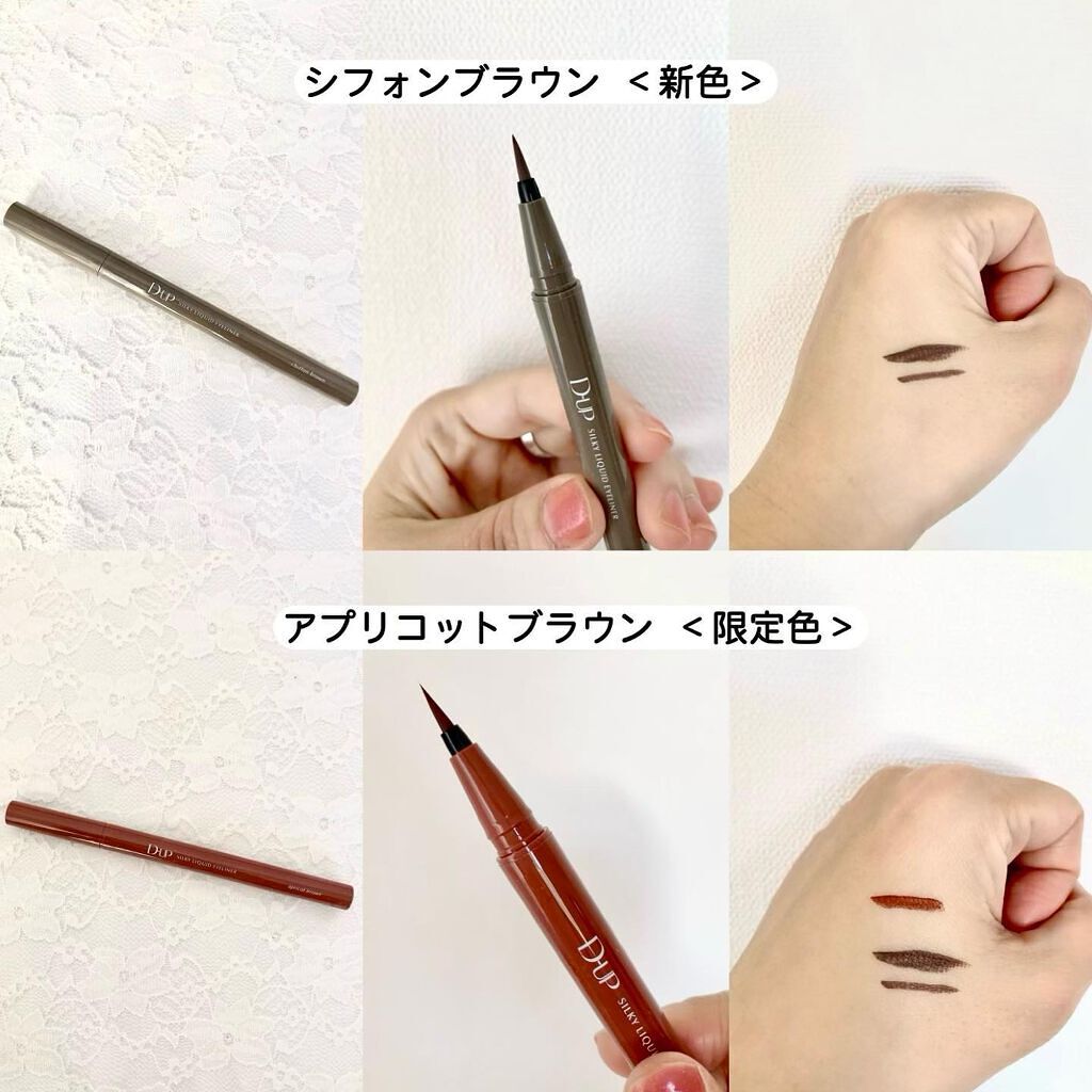 シルバーやブルーの多色ラメがキラッとしてる! DUPの他のアイライナーより筆の根元が少し太め?でも筆先は同じく細いです️✒️ ラメ入りの透明感が出てくれるアイライナー✨️ ほんのりキラッとしてくれて冬メイクやホリデーメイクにいいと思います(˶' ᵕ '˶)☃ ダークブラウンカラーですが寒色系ラメと合わさってアッシュやブラックに近い発色に!