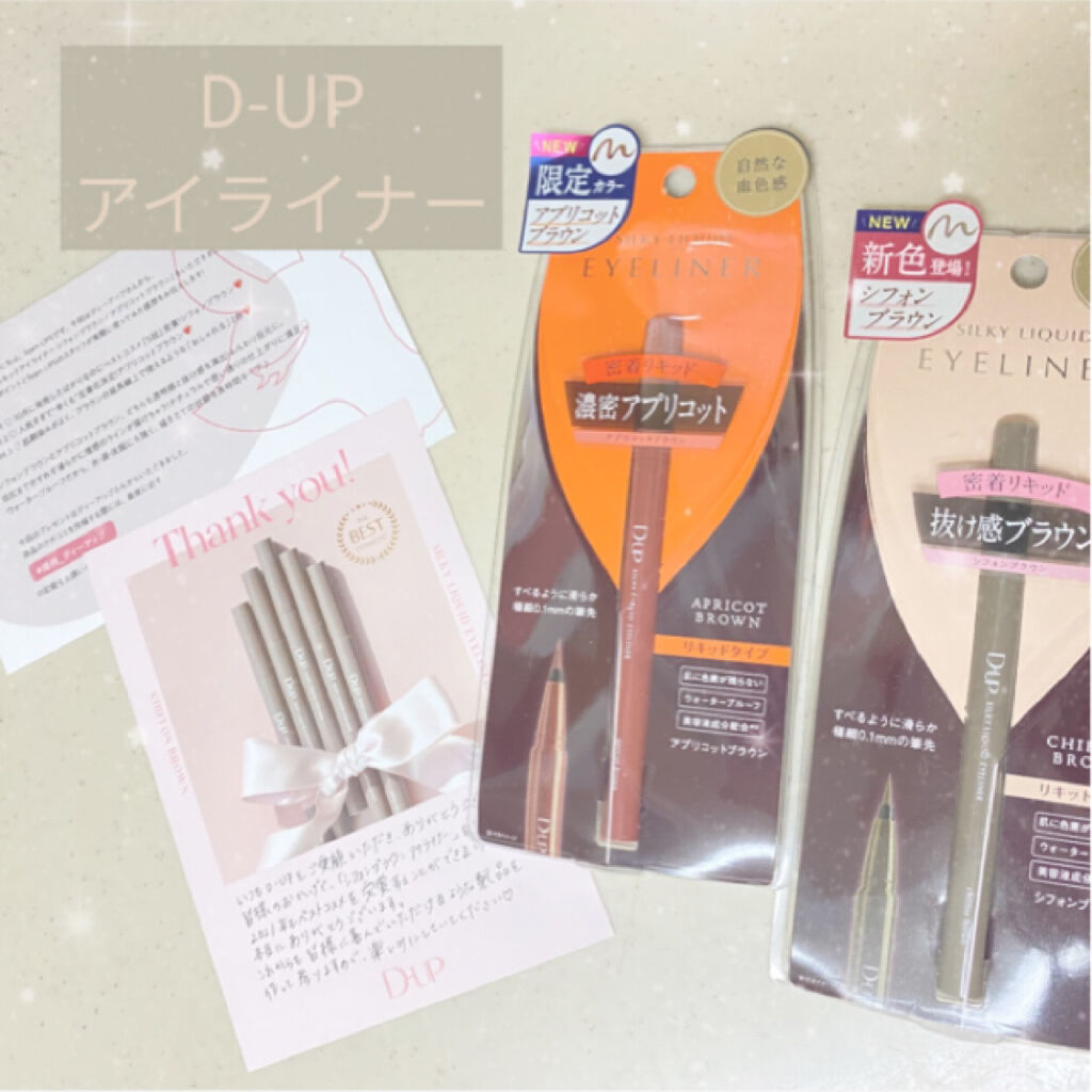 甘めブラウンアイライナー❤︎*.゜・D-UPシルキーリキッドアイライナーWP#アプリコットブラウン✧•✾•✧自然な血色感を感じるアプリコットブラウンカラーが可愛い!D-UPのシルキーリキッドアイライナーWPはにじみにくくて、描きやすいのでお気...