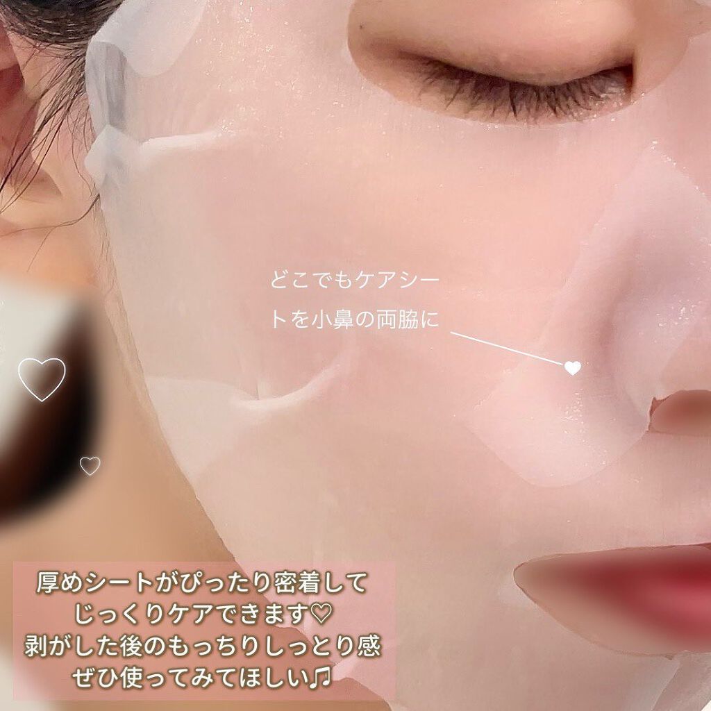 肌荒れを防ぐ消炎剤配合(有効成分) ✔️ セラミドの働きを補い、濃密な潤いをすみずみまで補給してくれるそう ✔️肌あたりやわらかなシートマスク 厚めのシートで肌あたりも良く、肌にピタッと密着してくれます。お肌が敏感な時でも優しい使い心地と、キメが整いもちっとする使用感がいいです。 マスクの下の部分は、切り離して小鼻等の隙間に貼れます。マスクのサイズによっては隙間ができるものもあるので、これも嬉しい。