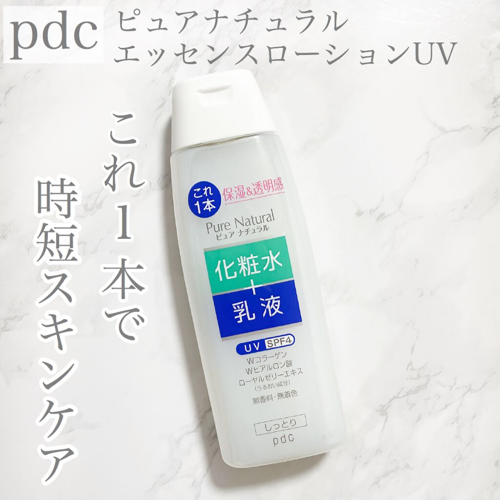 pdcピュアナチュラルエッセンスローションUVスキンケアをするのが面倒くさい時にとりあえずこれを使用してます😂❣️化粧水と乳液これひとつで乾燥対策にも✨乾燥による敏感肌にも🆗テクスチャーはとろっとしたみずみずしい乳液タイプ。肌馴染みがよくスー...