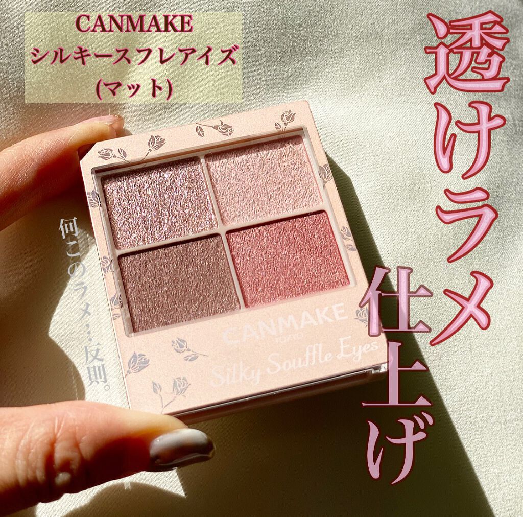キャンメイクシルキースフレアイズマットタイプM04キューピッドペタル¥825◇質感(マット3、小粒ラメ1)質感はマットですがふわっとしていて透け感があるので色を重ねても重くなったり濁ったりしないのが特徴です◎ラメは小粒ですが思った以上にキラッ...