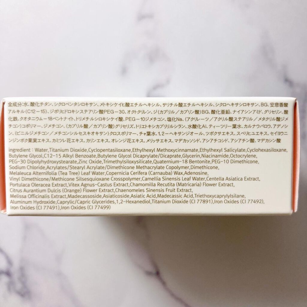 - 水、酸化チタン、シクロペンタシロキサン、メトキシケイヒ酸エチルヘキシル、サリチル酸エチルヘキシル、シクロヘキサシロキサン、BG、安息香酸アルキル(c12-15)、ジポリヒドロキシステアリン酸PEG-30、 オクトクリレン、ジ(カプリル/カプリン酸)BG、酸化亜鉛、ナイアシンアミド、グリセリン、クオタニウム-18ベントナイト、トリメチルシロキシケイ酸、PEG-1ジメチコン、酸化鉄、塩化Na、(アクリルーツ/アクリル酸ステアリル/メタクリル酸ジメチコン)コポリマー、ジメチコン、(カプリル酸/カプリン酸)グリセリズ、水酸化Al、トリエトキシカプリリルシラン、ティーツリー葉水、カルナウバロウ、アデノシン、(ビニルジメチコン/メチコンシルセスキオキサン)クロスポリマー、チャ葉水、1,2-ヘキサンジオール、ツボクサエキス、スベリヒユエキス、セイヨウニンジンボク果実エキス、カミツレ花エキス、オレンジ花エキス、メリッサエキス、カリンエキス、 マデカッソシド、アシアチコシド、アシアチン酸、マデカシン酸