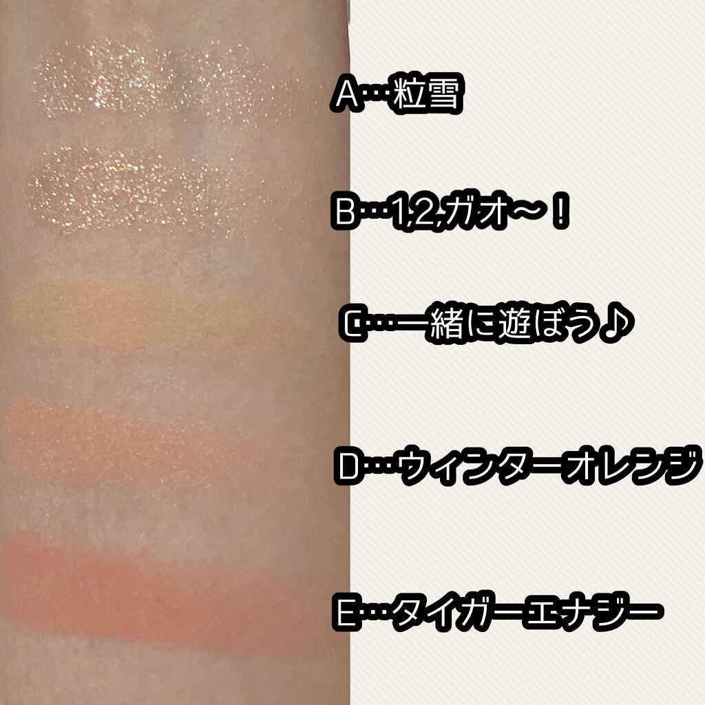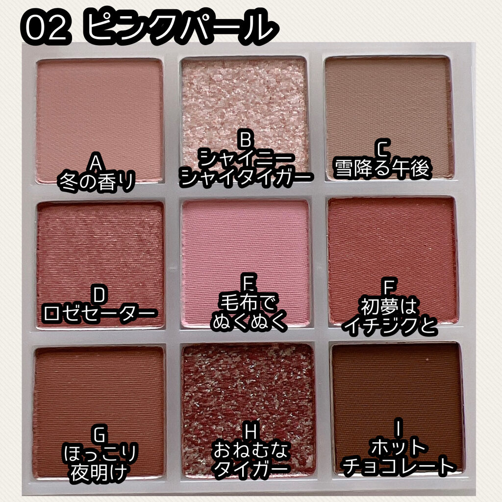 - ウォームとクールのそれぞれのトーンに合わせたオレンジトーンとピンクトーンの9色アイシャドウパレット。 しっかり発色のオレンジとピンクを引き立たせる多色ラメが艶めきと立体感をプラスし、 大粒のパールは雪を反射させたような煌めきを目元に与えます。 元気いっぱいのあなたにも、リラックスモードのあなたにも、ゆる~くのびのびと あなたの魅力を引き出すポップなEYEに♪