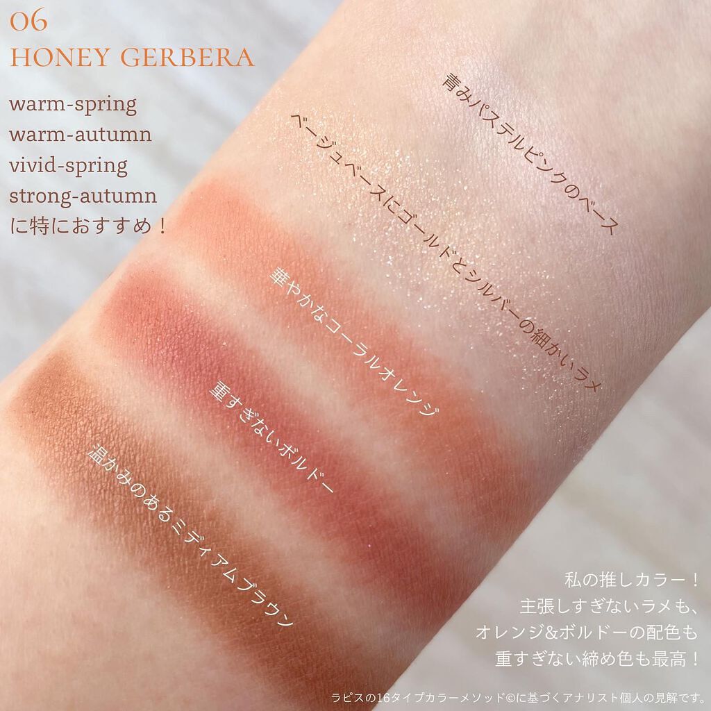水みたいに軽いツヤツヤな仕上がり。 ベタベタしないし、付けてる感が少ないので快適ですよ✨ 全体的にイエベに寄った色展開です。 もしブルベさんが使うなら03が一番馴染むかな? ウォームスプリングの私は圧倒的に04がお気に入りです〜!! 黄みたっっっぷり🍊 一度ティッシュオフをするとマスクにも付きづらいので是非試してみてください🥰