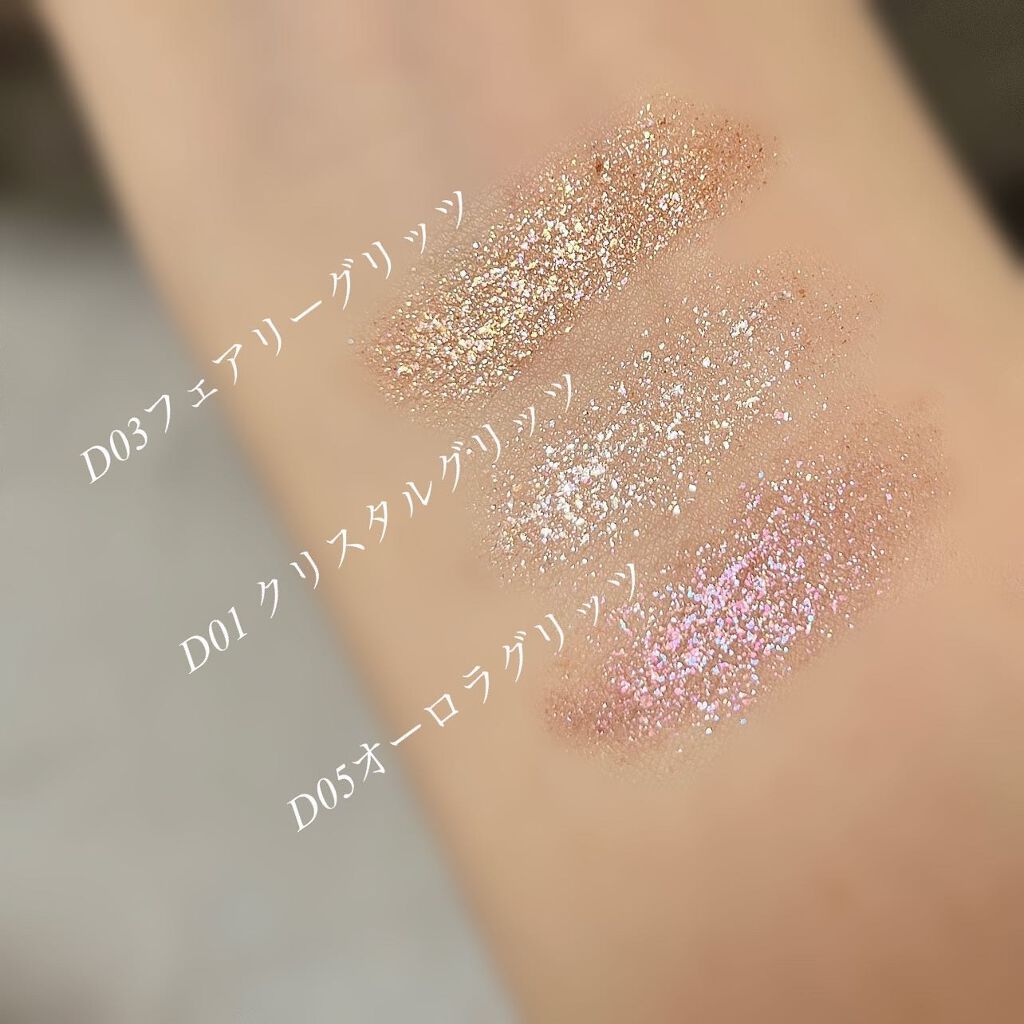 - <D01 クリスタル> シクロペンタシロキサン、トリメチルシロキシケイ酸、ホウケイ酸(Ca/Al)、メチルトリメチコン、水添野菜油、シリカ、ポリエチレン、セレシン、パラフィン、ステアリン酸亜鉛、合成フルオロフロゴパイト、ジメチコン、ホウケイ酸(Ca/チタン)、酸化スズ、マイカ、酸化チタン、酸化鉄、銀 <D02 ステラ> シクロペンタシロキサン、トリメチルシロキシケイ酸、メチルトリメチコン、ホウケイ酸(Ca/Al)、水添野菜油、シリカ、ポリエチレン、マイカ、合成フルオロフロゴパイト、ホウケイ酸(Ca/チタン)、セレシン、ホウケイ酸(Ca/Na)、パラフィン、ステアリン酸亜鉛、ジメチコン、酸化スズ、酸化チタン、酸化鉄、カルミン <D03 フェアリー> シクロペンタシロキサン、トリメチルシロキシケイ酸、メチルトリメチコン、ホウケイ酸(Ca/Al)、シリカ、水添野菜油、ポリエチレン、マイカ、合成フルオロフロゴパイト、セレシン、ホウケイ酸(Ca/Na)、パラフィン、ステアリン酸亜鉛、ジメチコン、酸化スズ、トリエトキシカプリリルシラン、酸化鉄、酸化チタン <D04 ペタル> シクロペンタシロキサン、トリメチルシロキシケイ酸、メチルトリメチコン、ホウケイ酸(Ca/Al)、シリカ、マイカ、水添野菜油、ポリエチレン、セレシン、パラフィン、ステアリン酸亜鉛、合成フルオロフロゴパイト、ジメチコン、酸化スズ、トリエトキシカプリリルシラン、酸化鉄、酸化チタン、カルミン <D05 オーロラ> シクロペンタシロキサン、トリメチルシロキシケイ酸、ホウケイ酸(Ca/Al)、メチルトリメチコン、水添野菜油、シリカ、ポリエチレン、マイカ、セレシン、パラフィン、ステアリン酸亜鉛、ジメチコン、酸化スズ、トリエトキシカプリリルシラン、酸化鉄、酸化チタン、カルミン <D06 インフィニティ> シクロペンタシロキサン、トリメチルシロキシケイ酸、メチルトリメチコン、ホウケイ酸(Ca/チタン)、水添野菜油、シリカ、ポリエチレン、ホウケイ酸(Ca/Al)、合成フルオロフロゴパイト、セレシン、パラフィン、ステアリン酸亜鉛、ジメチコン、酸化スズ、マイカ、酸化鉄、酸化チタン、銀