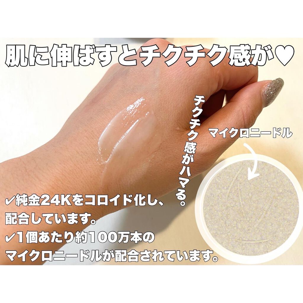 - 純金24K*1とニードルが100万本配合 ・純金24K*1をコロイド化し、配合しています。 ・1個あたり約100万本のマイクロニードルが配合されています。 5つの美容成分で様々な悩みにアプローチ 5つの美容成分で、毛穴、肌荒れ予防、ハリ不足、乾燥小じわ*2、乾燥によるくすみにアプローチ。 *1 整肌成分 *2乾燥による小じわを目立たなくする(効能評価済み)
