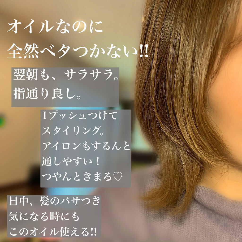 【香り】◎華やかで心地よいフローラルブーケの香り ほのかに香る程度で、ちょうどいい! 万人受けな感じ🙆♀️✨ 【テクスチャ】◎とってもサラッとしたオイル✨ 手もベタつかない❗️ 【どんな人におすすめ?】◎しっとりよりもサラサラの質感が好きな方に!◎よくアイロンを使う方に! 【良いところ】◎サラサラのオイルなので、全然ベタつかない❗️毎日使いやすい!◎濡れた髪にも、乾いた髪にも使える♪◎アイロン前にも使用OK👌💕◎するんするんのまとまりあるサラサラつやつや髪に仕上がる✨◎パサつき気になる時、日中も使える✨◎香りはキツくなく、ほのかに香る程度! フローラルのいい香り♥️ 【イマイチなところ】ほとんどみつかりませんが...✔しっとり感が好きな方にはちょっと物足りないかもです。 ...というぐらいでしょうか😂
