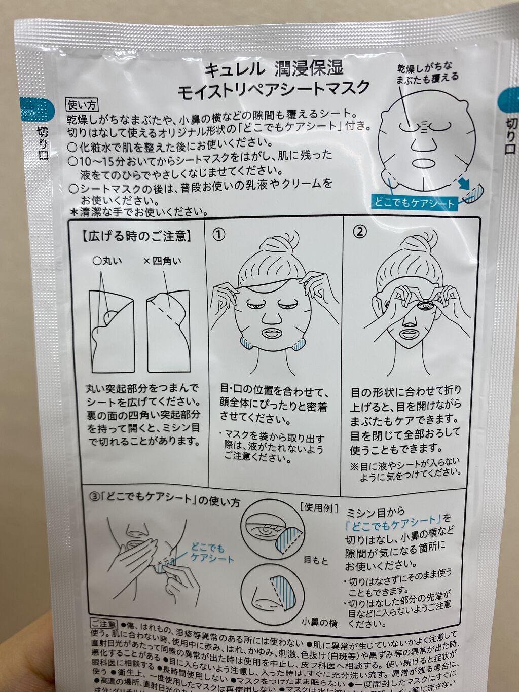 肌あたりのやさしいやわらかシートでまぶたも小鼻もスキなくフィット!しっかり肌を包み込んでくれるようなシートマスクだよ😊 切りはなして使えるどこでもケアシートがついてるの!これまた便利で目まわりや口もと、小鼻わきなど隙間が気になるところに使えるの! パックのあとはお肌うるるん♩しっとりするのにベタつきを感じないよ。