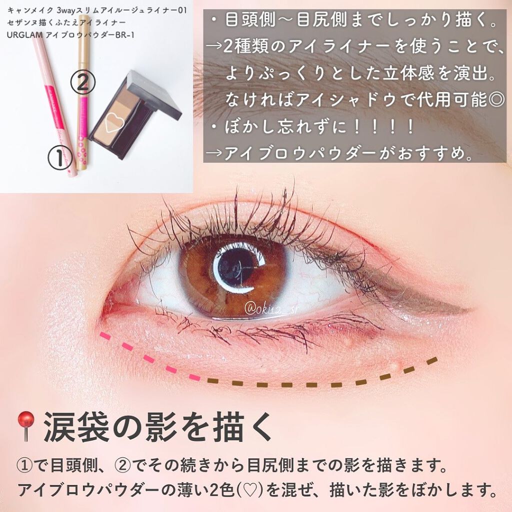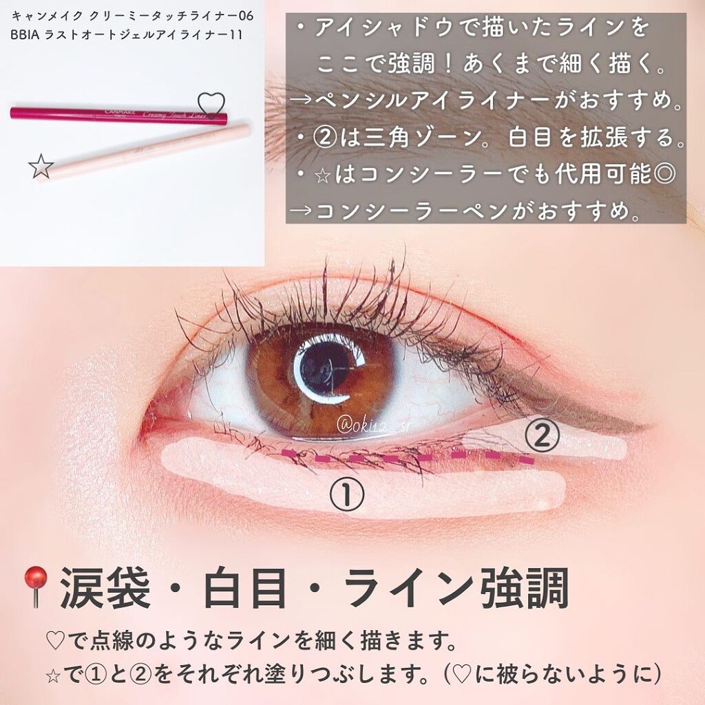 アイラインであったり涙袋の工夫次第で、目元の印象は大きく変えられるよ! 使用しているコスメも今回はこれだっただけで、服装や髪色、リップなど他のコスメに合わせて好きなものを使ってOKです!