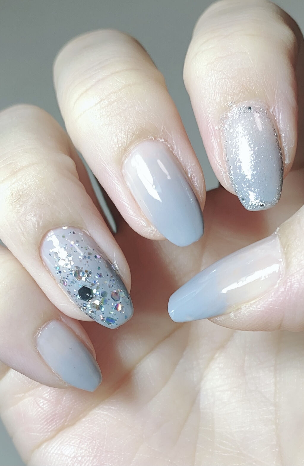 可愛い💕とにかく可愛い💕💕 発色アップさせるのに、ベースコートにクイックスムージングベースを使います❣️ キャンメイクのファンデーションカラーズNo.03、シアーライラックを3度塗りします💕 MTC マットトップコートで磨りガラス風のベースの完成✨ フレンチをネイルホリック アートSV082で太めに書書きます🥰 セリアのホログラムを乗せ、フレンチ部分だけトップコートを塗って完成💕 ガラスフレンチの部分はアルミっぽくなりますが、それも可愛いです😍💙