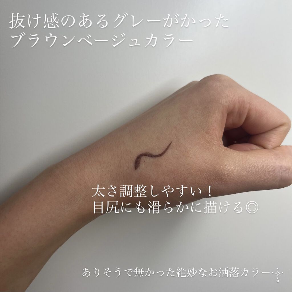 しなやかでコシのある筆が筆圧のコントロールを容易にし、太いラインも細いラインも思い通りに。 シフォンブラウンは、ナチュラルメイクが好きだけどアイラインはしっかり描きたい方におすすめのカラーな感じ! 主張があまりなく、抜け感を意識した仕上がりをつくってくれる👀🤍